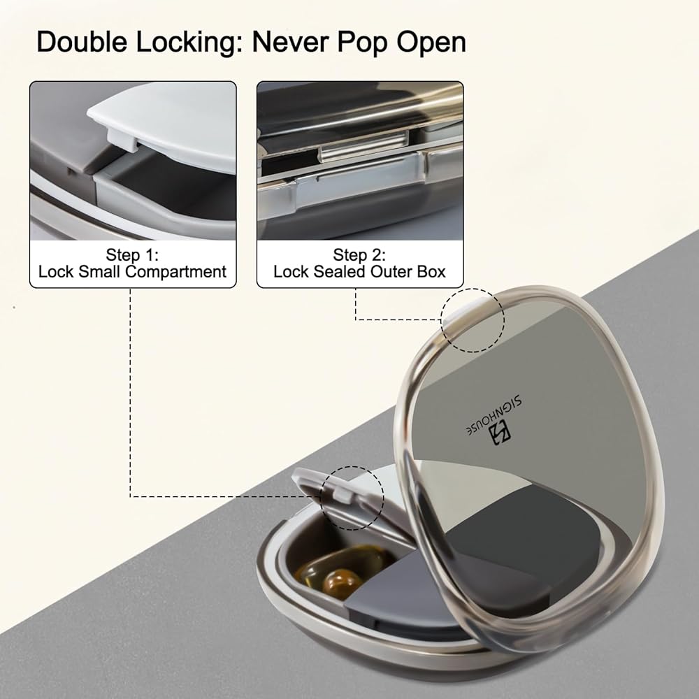 Double Lock and Removable Compartment Design: The outer container and each compartment have their own lid, double locked so that the lid does not fall open and drop the medicine if the box is dropped or shaken excessively in the bag. 5 compartments (4 small and 1 large), each compartment is removable and easy to clean.