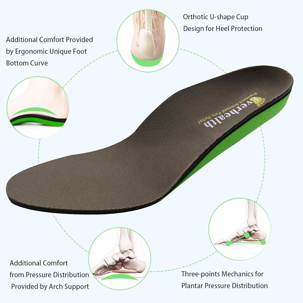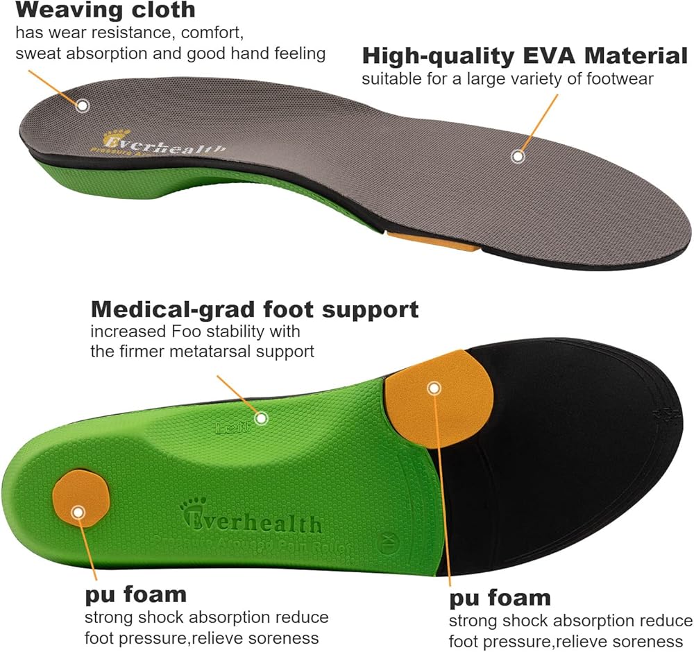 ✔ORTHOTIC ARCH SUPPORT: These shoe inserts feature 3.5cm high and firm foot arch support for pressure relief on feet, ankles, and knees, the deep heel cup for the foot a firm hold and to provide optimal shock attenuation at heel strike. It relieves foot fatigue or pain caused by prolonged standing or walking, corrects abnormal walking patterns, relieves metatarsalgia, Achilles tendonitis, flat feet, overpronation, common foot pain, arch/heel pain & plantar fasciitis.