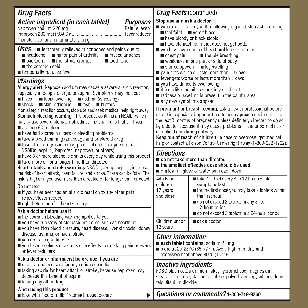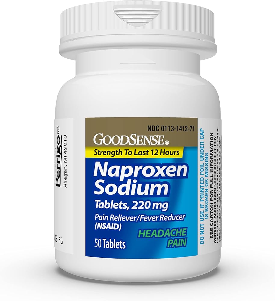 Compare to Aleve headache pain tablets active ingredient. Your headache pain deserves the power of a pain reliever with strength to last all day. Good Sense Naproxen Sodium tablets 220 mg, headache pain active ingredient contains 220 mg of Naproxen Sodium, a nonsteroidal anti-inflammatory drug (NSAID) pain reliever and fever reducer. Made for adults and children ages 12 years and older who are looking for 12-hour headache pain relief with one dose. Don't let another 12 hours go by without headache pain relief. Use to temporarily relieve minor aches and pains due to minor pain of arthritis, muscular aches, backache, menstrual cramps, headache, toothache, and the common cold, and temporarily reduces fever. This product is Gluten Free.