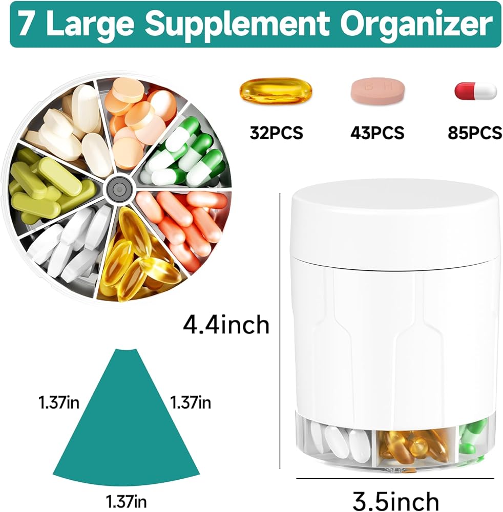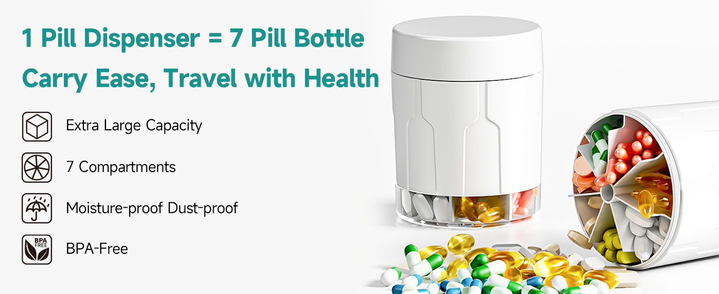 Easy to Organize Medication: The supplement organizer can replace 7 different pill bottles at once, which is enough to simplify your pill-taking routine. No more opening several bottles when it's time to take your pills!