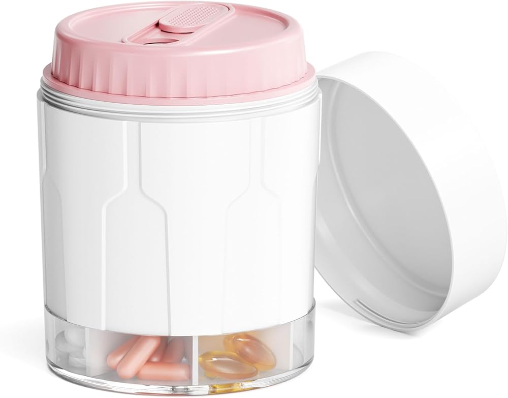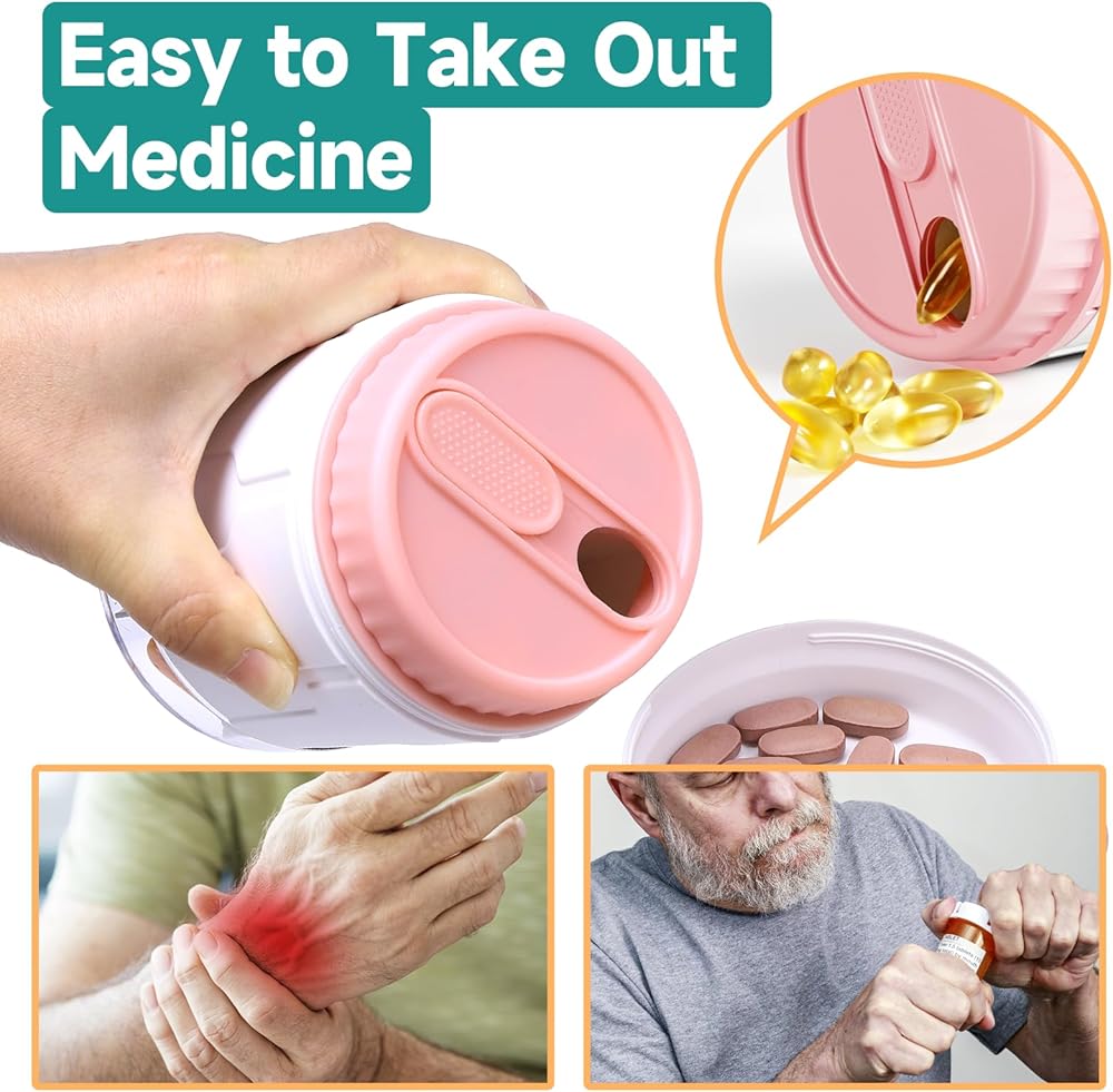 Super Simple to Use: The large pill organizer flexible rotary lid and wide opening are designed to make taking medication effortless. Turn the round inner lid and slide the oval closure to remove vitamins or pills from each compartment and pour them out easily.