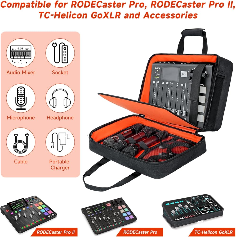 【Specially Customized】Size: 16.75''L*12''W*7.5''H(Main compartment:4.5''H). This audio mixer case is compatible with RODECaster Pro, RODECaster Pro II、TC-Helicon GoXLR.(Case only)Note: For other mixer models, please measure before purchasing to ensure fit.