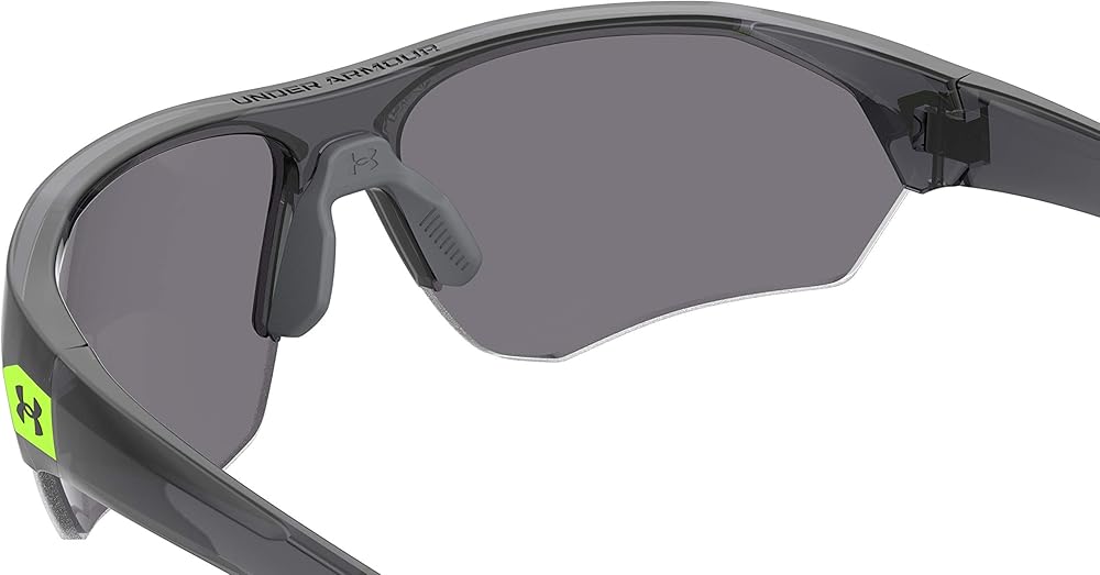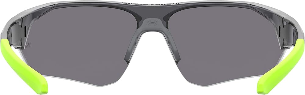 Signature wordmark and laser etched logo on lens. Electroform logo on side of right and left temple Under Armour wordmark on top of frame and on end pieces