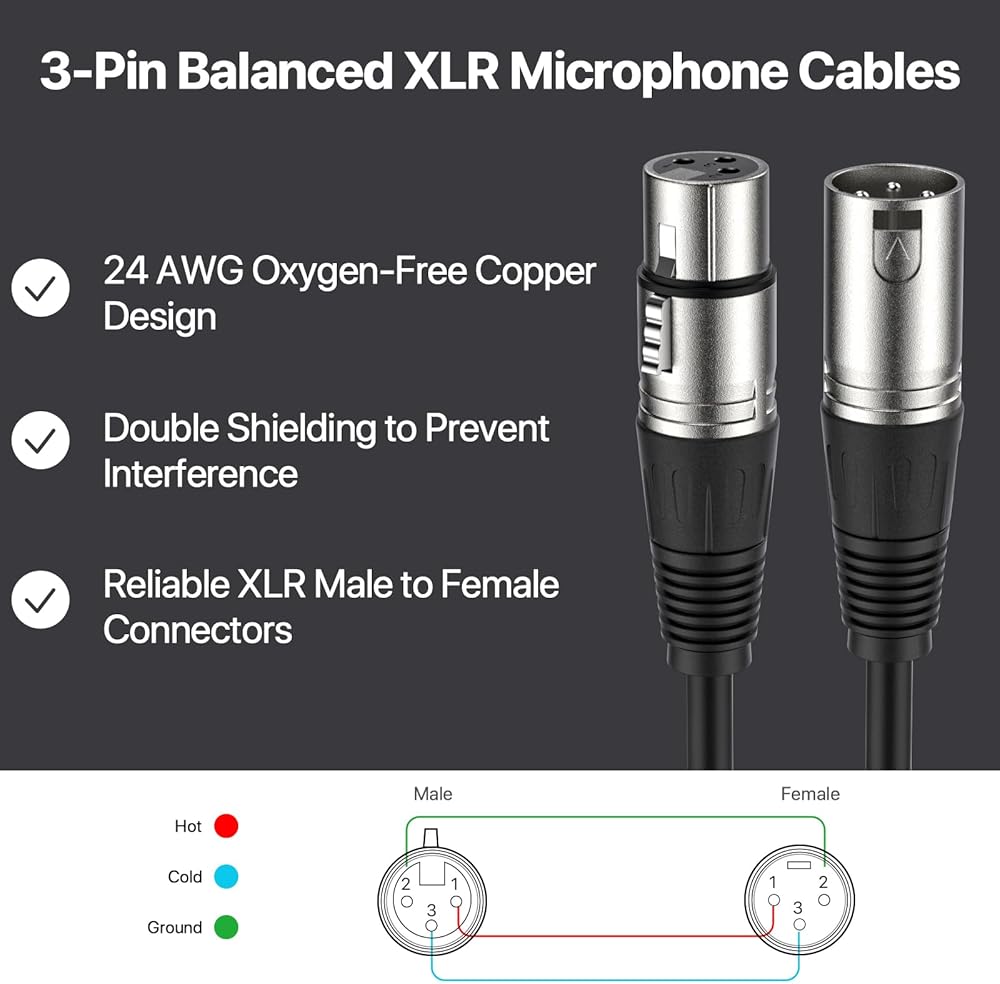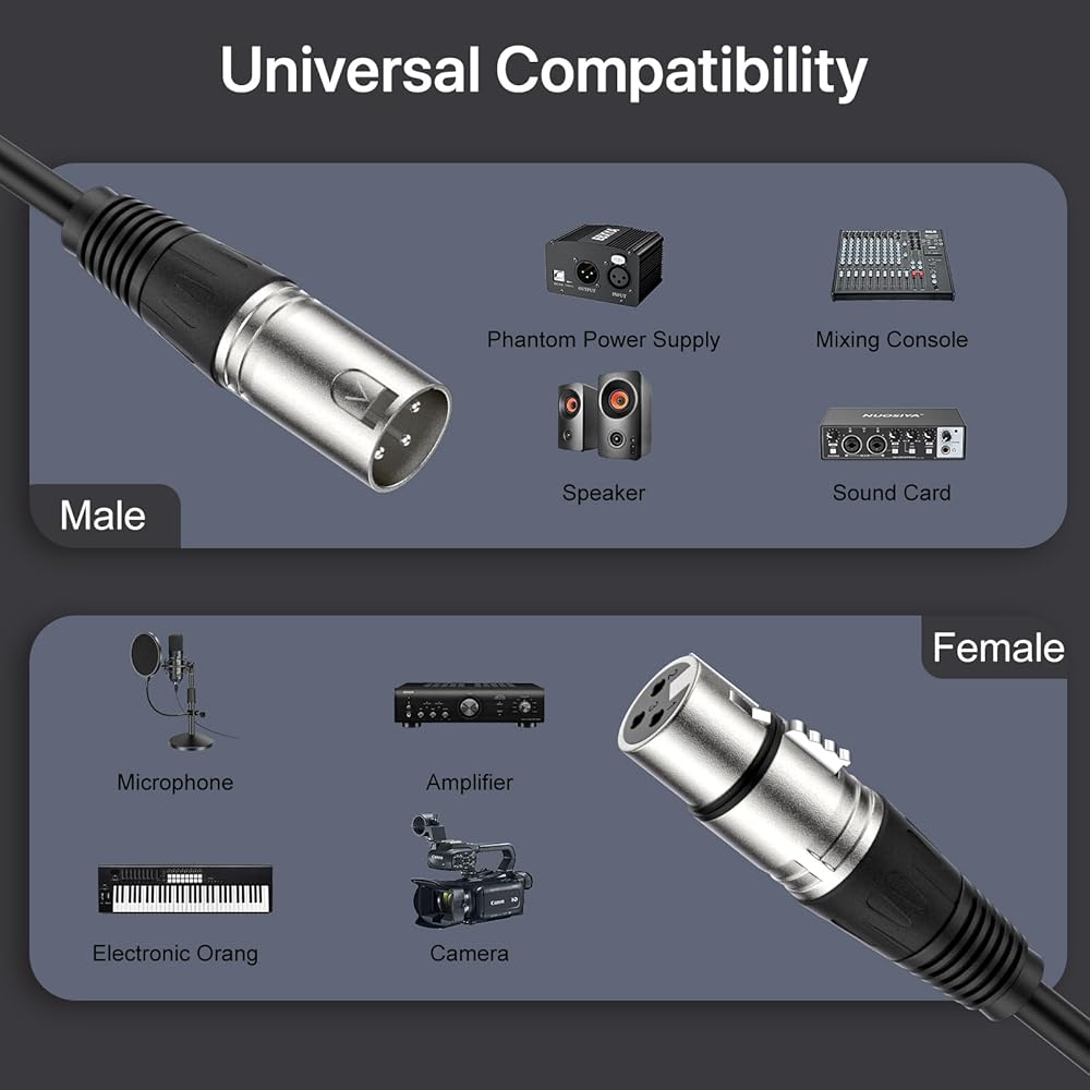 WIDELY COMPATIBILITY - Balanced XLR Speaker cables designed for equipment with 3-pin XLR connectors, with superior clarity to help your instrument sound flow in a clear and natural way, which can be connected to any music recording equipment with a 3-pin xlr connector, such as Microphones, Mixers, DMX Stage Lighting, Mixing Boards, Speaker Systems, etc.