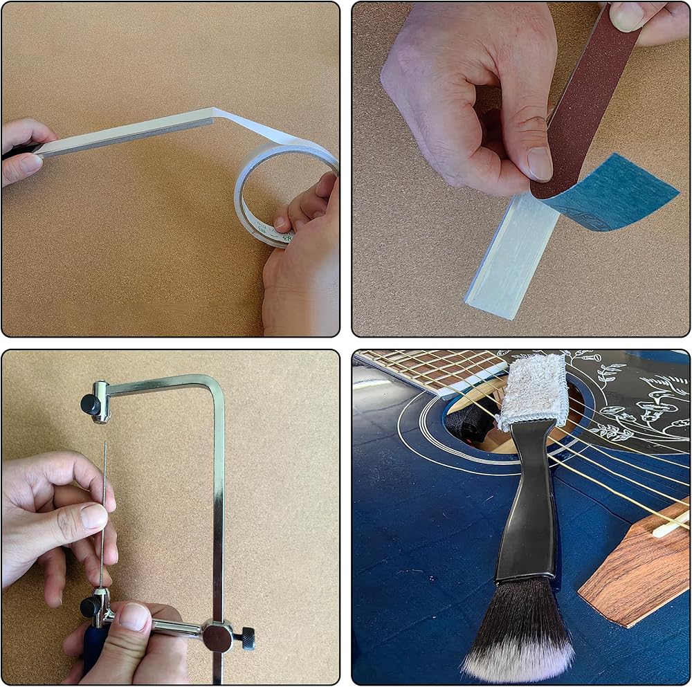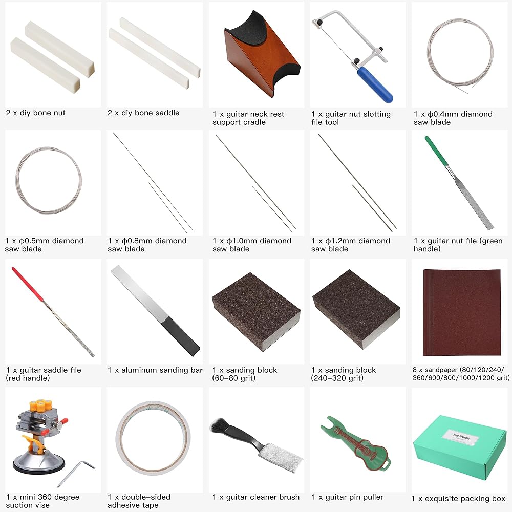 8pcs 80 to 1200 grit sandpaper & 2pcs sanding block: Used to smooth and refine the surfaces of the nut and saddle for optimal fit and finish.