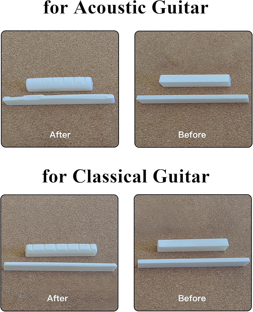Measuring and Marking: Measure the existing nut and saddle on the guitar, or use standard measurements for your specific guitar model. Mark the bone material accordingly, making sure to leave extra material for adjustments during the fitting process.