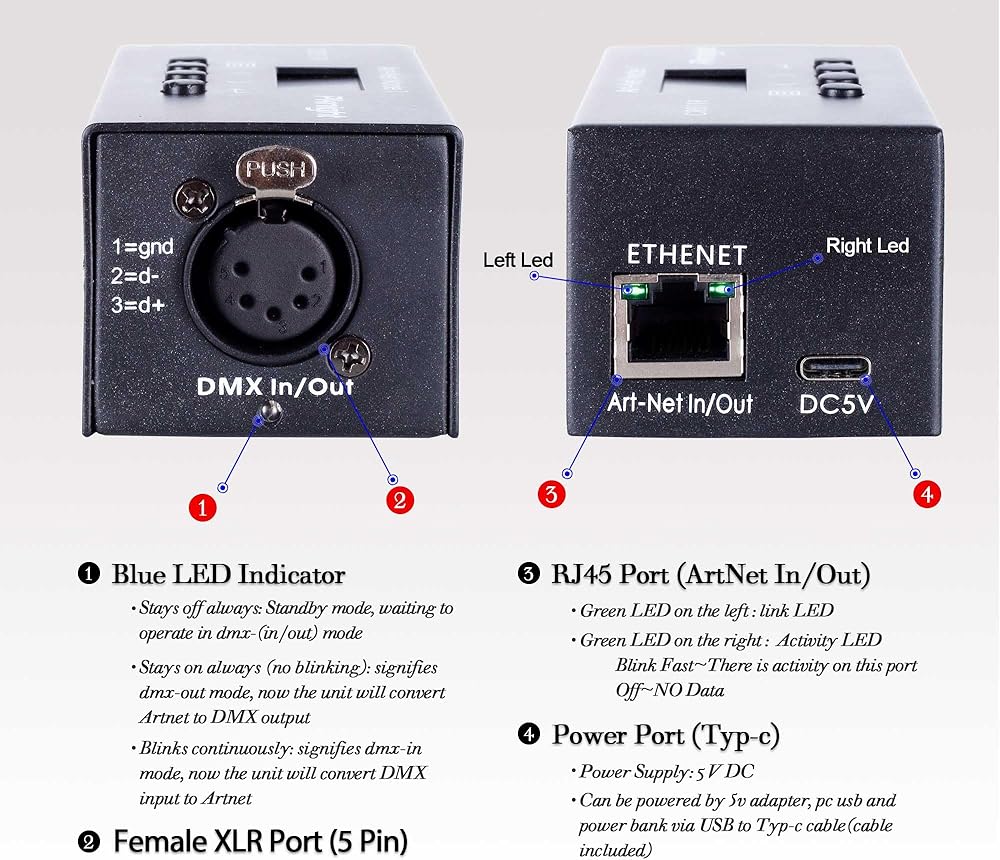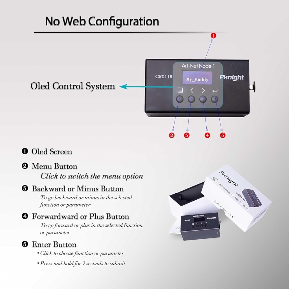 Bi-directional Artnet box: Featured with DMX Input and output mode, the Pknight CR001R can be a bi-directional Artnet box. Just set the “Transmit mode” to be “artnet < - dmx”, When there is an external DMX signal input, the DMX will be converted to artnet.