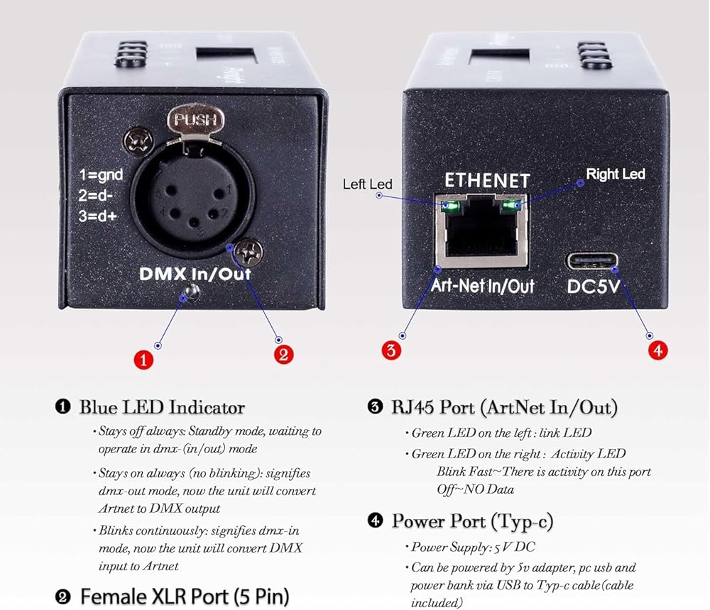 One Universe: 1x DMX512 Out (3pin) with Art-Net, control up to 512 channels.