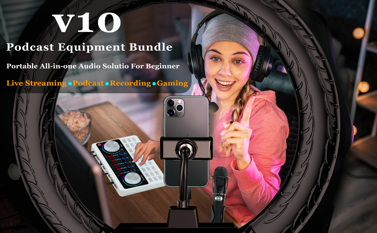 【بث مباشر لبطاقة الصوت 】مباشر على منصات متعددة مع الأصدقاء في الداخل/الخارج مع توصيل إدخال/إخراج قنوات متعددة للبث المباشر. تدعم مجموعة البودكاست ما يصل إلى شخصين و3 منصات للبث المباشر في وقت واحد. صندوق معدات استوديو التسجيل: 1 × لوحة مزج تعمل بالطاقة، 1* ميكروفون مكثف للاستوديو، 1* حامل ميكروفون، 1* وحدة تحكم V10، 1* مشبك ميكروفون، 1* سماعة شاشة 3.5 ملم، 1* كابل ميكروفون XLR إلى 3.5 ملم، 1* كابل شحن USB صغير، 2*3.5 ملم صوت TRRS كابل، 1 * دليل مستخدم بموجه الصوت.