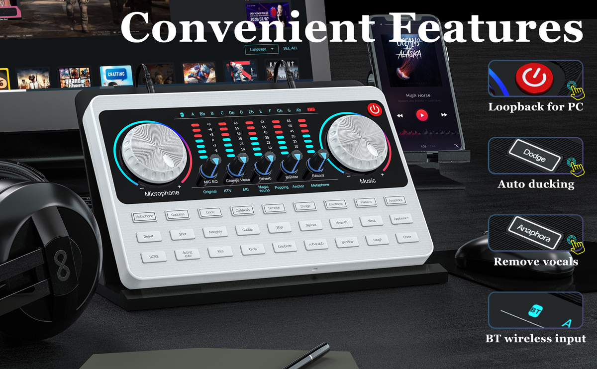 【خلاط صوت مع تأثير غني وتغيير الصوت】يحتوي خلاط معدات الاستوديو على 6 اختلافات صوتية أنثى/ذكر/طفل/وحش، تم تصميم الوظائف الشائعة للتسجيل ومسجل الصوت مع تشغيل ضبط غناءك وتأثيراتك الصوتية على مكتب الاستوديو. تتميز بنغمات إلكترونية مكونة من 12 خطوة، و5 أوضاع خلط احترافية، و18 مؤثرًا صوتيًا مثيرًا للاهتمام؛ الأزرار: Dodge وDenoise وAnaphora وLoopback (زر الطاقة) تجعل واجهة الصوت هذه مفيدة للبث المباشر أو البث الصوتي