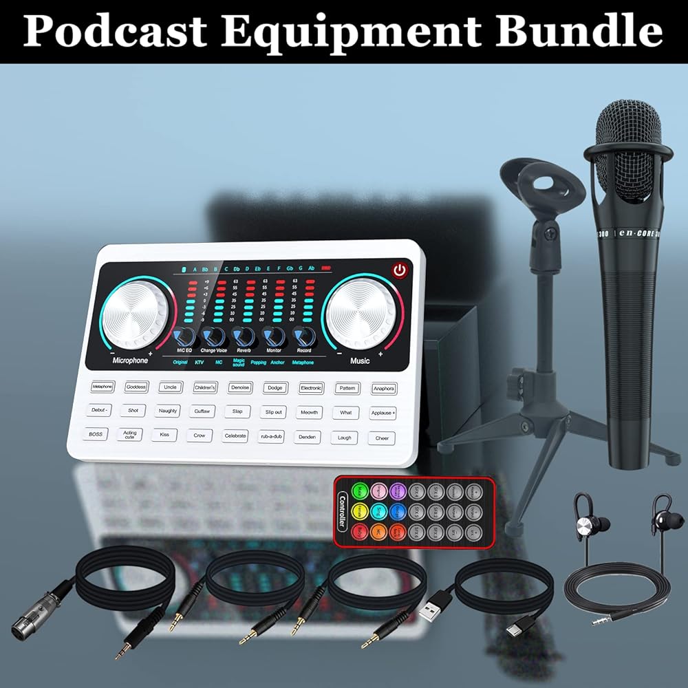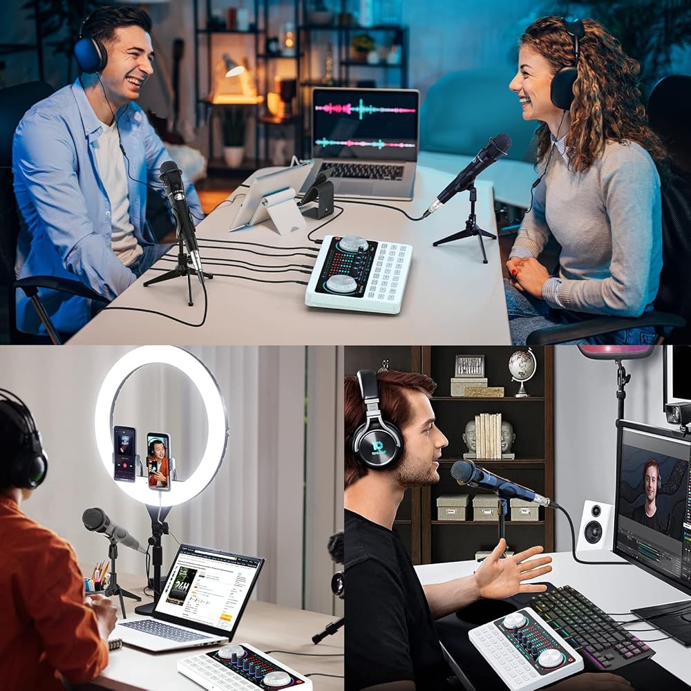 حزمة معدات البودكاست واجهة الصوت بطاقة الصوت الحية DJ Mixer Kit مع ميكروفون مكثف XLR لوحة تغيير الصوت للاستوديو/التسجيل/البث/البث/الألعاب على الهاتف/الكمبيوتر الشخصي/Mac/الكمبيوتر المحمول
