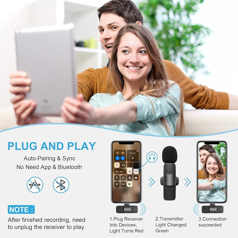 【Plug & Play and Hands-Free】No Adapter/Addtional APP/ Bluetooth needed, just 2 steps to connect. Step 1: Plug the receiver into your devices; Step 2: Power on the microphones. Say goodbye to messy cables, and the wireless lapel lavalier microphones can be clipped on the collar to free your hands for audio video recording, make your live streaming more relaxed and enjoyable!