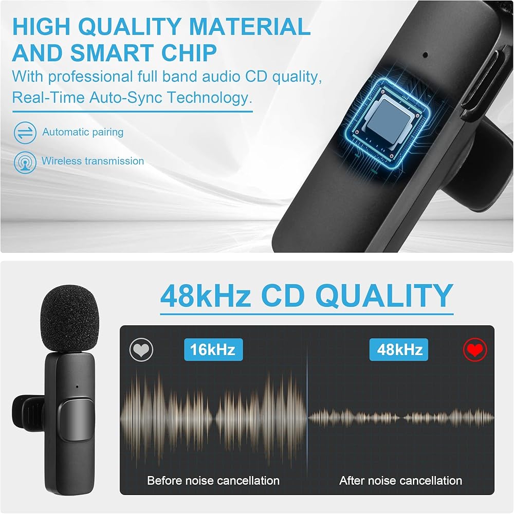 【Superior Noise Reduction & Real-time Auto-sync】This omnidirectional wireless lavalier microphone is built with professional-grade intelligent noise reduction chips, providing effective identification of the original sound and clear recording in noisy environment. The real-time auto-sync technology extremely reduce the time of video post-editing, supporting a better experience in videos being watched.