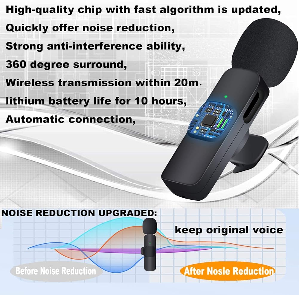 【Dual Wireless Microphones】This Wireless Microphones have two Lavalier Microphones with upgraded noise reduction,mini microphone for iphone can meet more scenes such as two-person live stream for TikTok,interview,meeting,video recording,team working on line.high-quality chip with fast algorithm make the original voice more clear by strong anti-interference ability,such an excellent tiny microphone set make you work outstanding in live show;