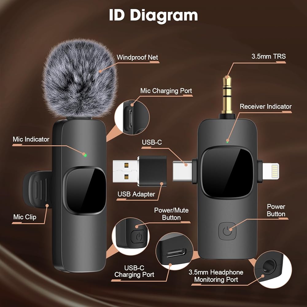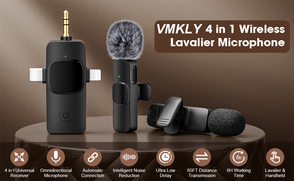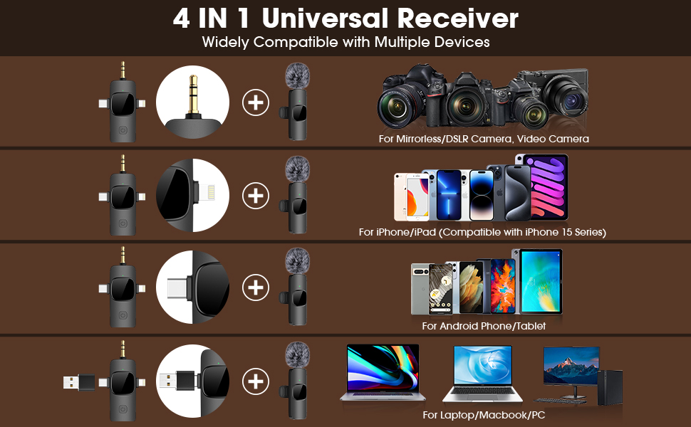 4 in 1 Wireless Lavalier Microphones: upgraded 4 in 1 universal receiver with USB-C/3.5mm TRS/USB Plug, it is compatible with iPhone/iPad/Android Phone/Camera/Computer/Laptop/Macbook, etc. The receiver can connect two microphones at the same time.