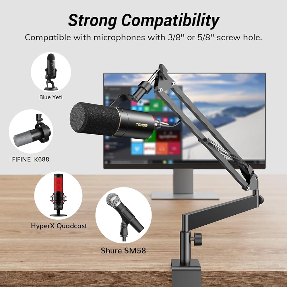 High Compatibility: The boom arm is equipped with 3/8'' size screw and includes a 5/8'' adapter screw, ensuring compatibility with both sizes of microphone screw holes. This allows for seamless pairing with any microphone and shock mount, providing a professional recording experience without limitations.