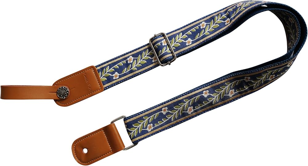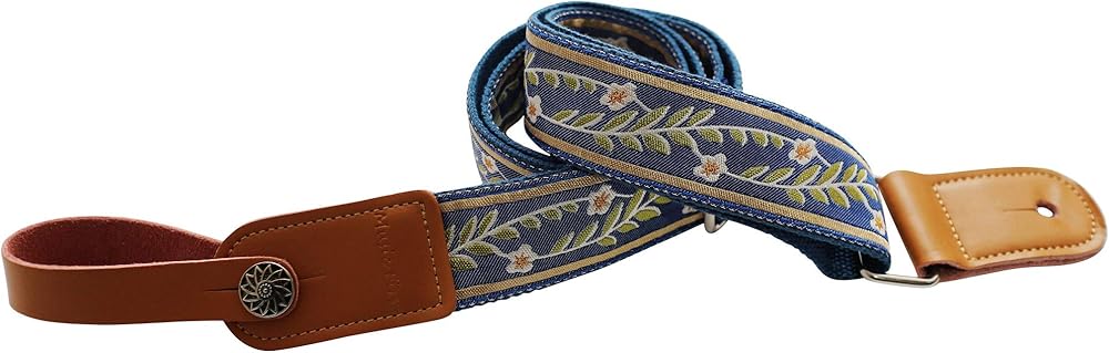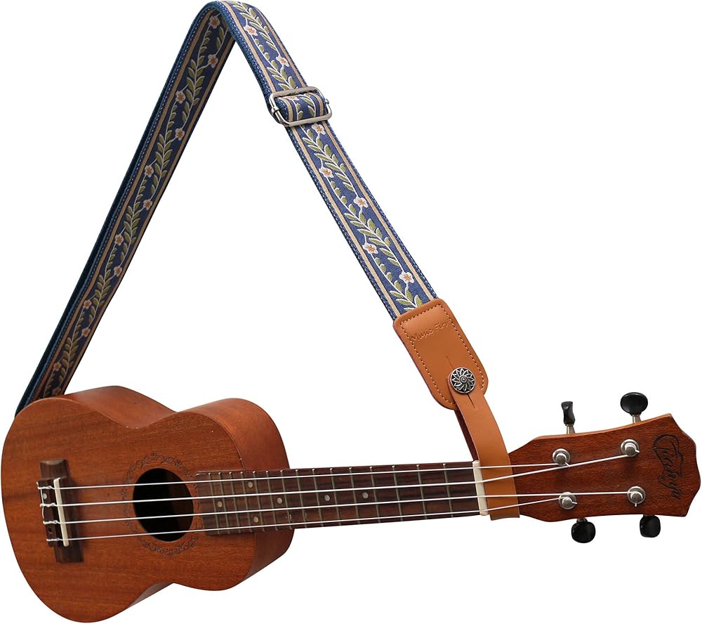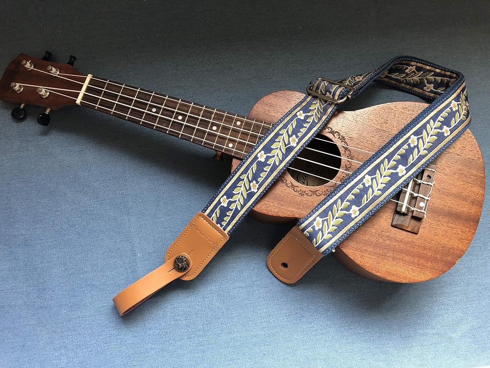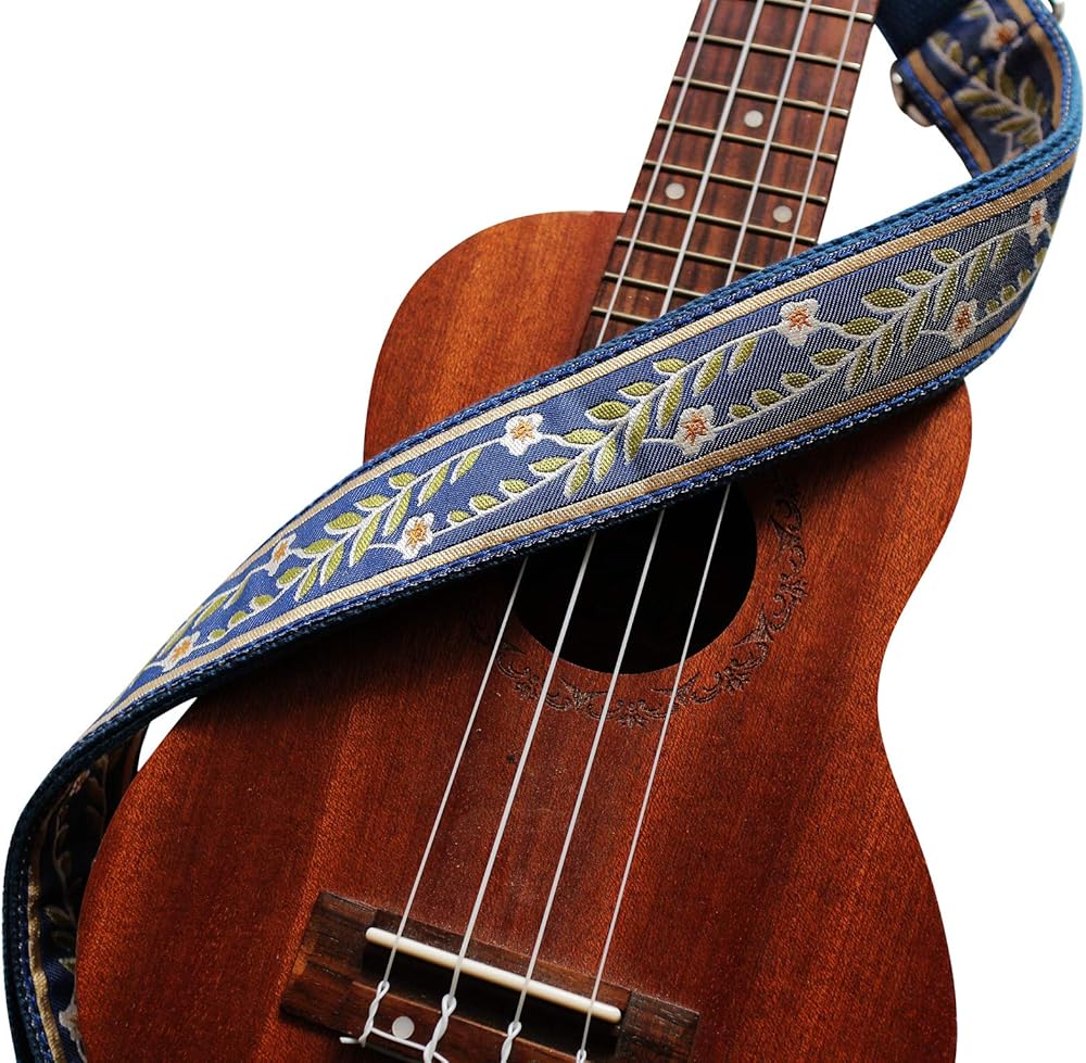 MUSIC FIRST Original Design Vintage Blue "Jasmine" Soft Cotton & Genuine Leather Ukulele Strap Ukulele Shoulder Strap With a MUSIC FIRST Genuine Leather Strap Locker / Beautiful Vintage Style Jasmine Patterned Cotton Strap with Genuine Leather Strap End / Material: Cotton (out side) + Genuine leather+ Cotton (inner side)+Metal Accessories / Width: 1.5inch (3.8cm); Length: 48inch ~ 27.5inch (122cm~70cm) adjustable; Thickness: 0.13inch (0.33cm) / One piece of MUSIC FIRST Ukulele Strap Locker (Worth $7.99) + One Golden color strap nail included. (The ukulele in the picture is not included)