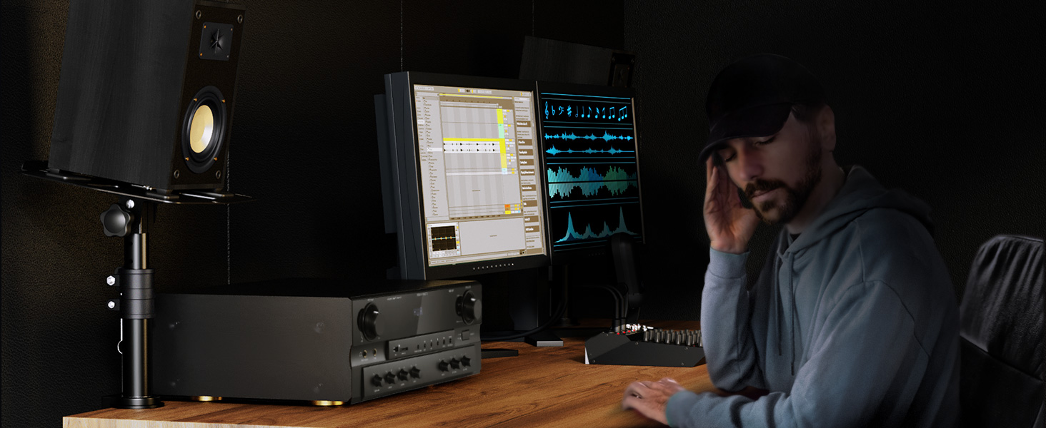 حوامل مكبر الصوت SS-01 - نحن لا نبخل باستخدام مواد الحديد الممتازة، على عكس مكبرات الصوت المكتبية الأخرى الموجودة في السوق، فإن منتجاتنا تزن حتى 13 باوند. تسمح مشابك التثبيت السميكة لجهاز SS01 بالتثبيت بإحكام على سطح المكتب، مما يزيد من الثبات. وتدعم المنصات العريضة شاشات الاستوديو مقاس 3 انش إلى 10 انش ومكبرات الصوت على رف الكتب في الاتجاهين الرأسي والأفقي، مما يحسن أداء مكبر الصوت ويوفر أداء عزل فائق أثناء المراقبة والمزج.