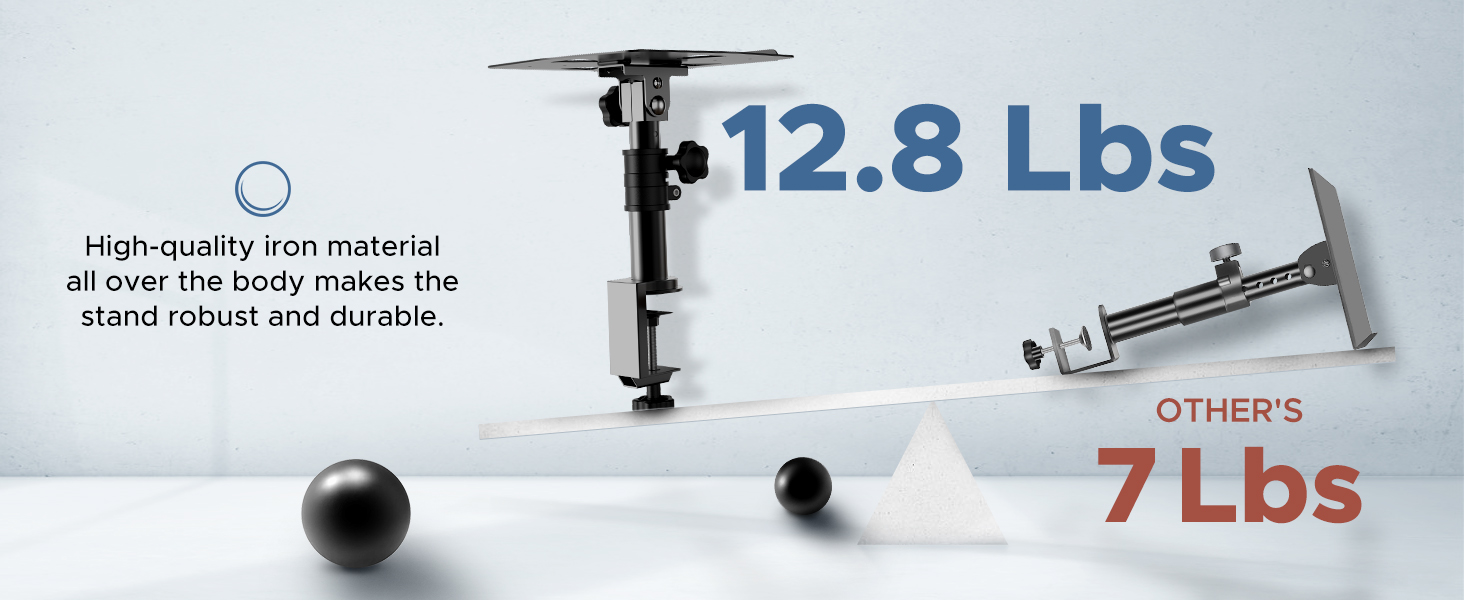 مساحة خالية - بالمقارنة مع حامل مكبر الصوت التقليدي، فإن المشبك الموجود على حامل مكبر الصوت المكتبي يشغل فقط 8 انش × 8 انش، مما يوفر مساحة كبيرة على سطح المكتب ويحافظ على سطح المكتب أنيقًا ومرتبًا. يسمح تصميم المشبك للحامل بـ "عض" سطح المكتب بإحكام ولا يهتز ويسقط بسهولة.