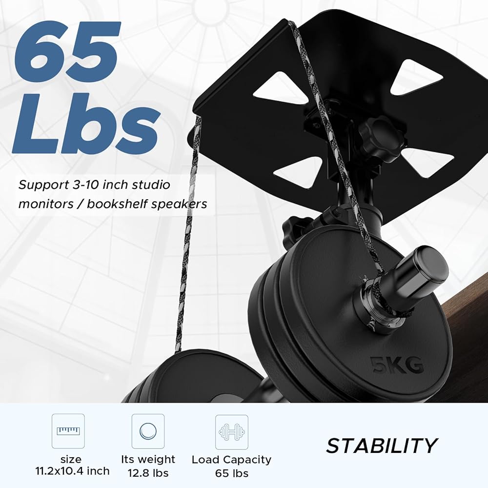 سعة تحميل عالية - كما تم اختباره، يمكن لكل حامل مكبر صوت مكتب أن يحمل حمولة قصوى تصل إلى 65 باوند، ولوحة مقاس 10.4 انش × 11.2 انش تناسب مكبرات صوت شاشة الاستوديو ومكبرات الصوت على رف الكتب ومكبرات الصوت المحيطية بأحجام مختلفة (3 انش - 10 انش). بسبب سعتها القوية، يمكنك وضع مكبرات الصوت الثمينة الخاصة بك على الحوامل دون قلق.