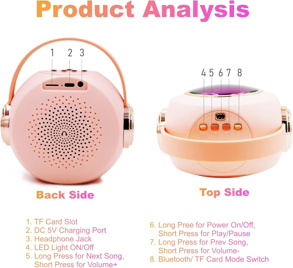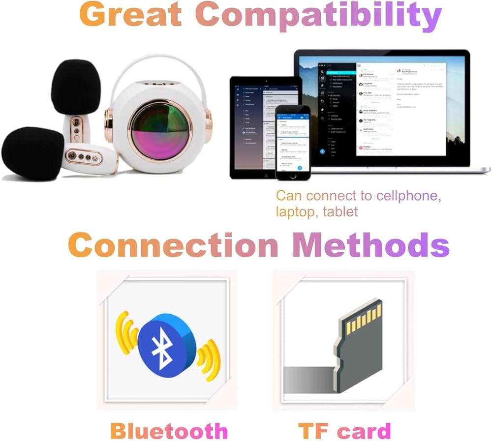 ♪Attractive Features: 1) Great Compatibility: It supports to connect with Mobile devices via Bluetooth for music, such as Cellphone, ipad or other devices. It also support TF card for music source. 2) With Two Microphones: Not only will you and your youngsters have hours of fun with this karaoke machine; 3) With Built-in Lithium Battery: This Karaoke machine can be rechargeable with provided USB cable, which is charged fast and last longer.