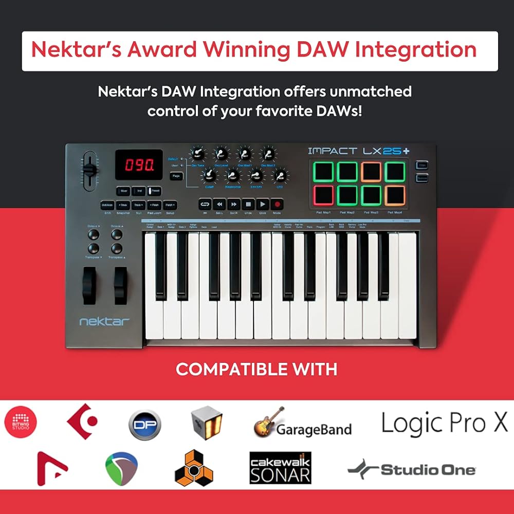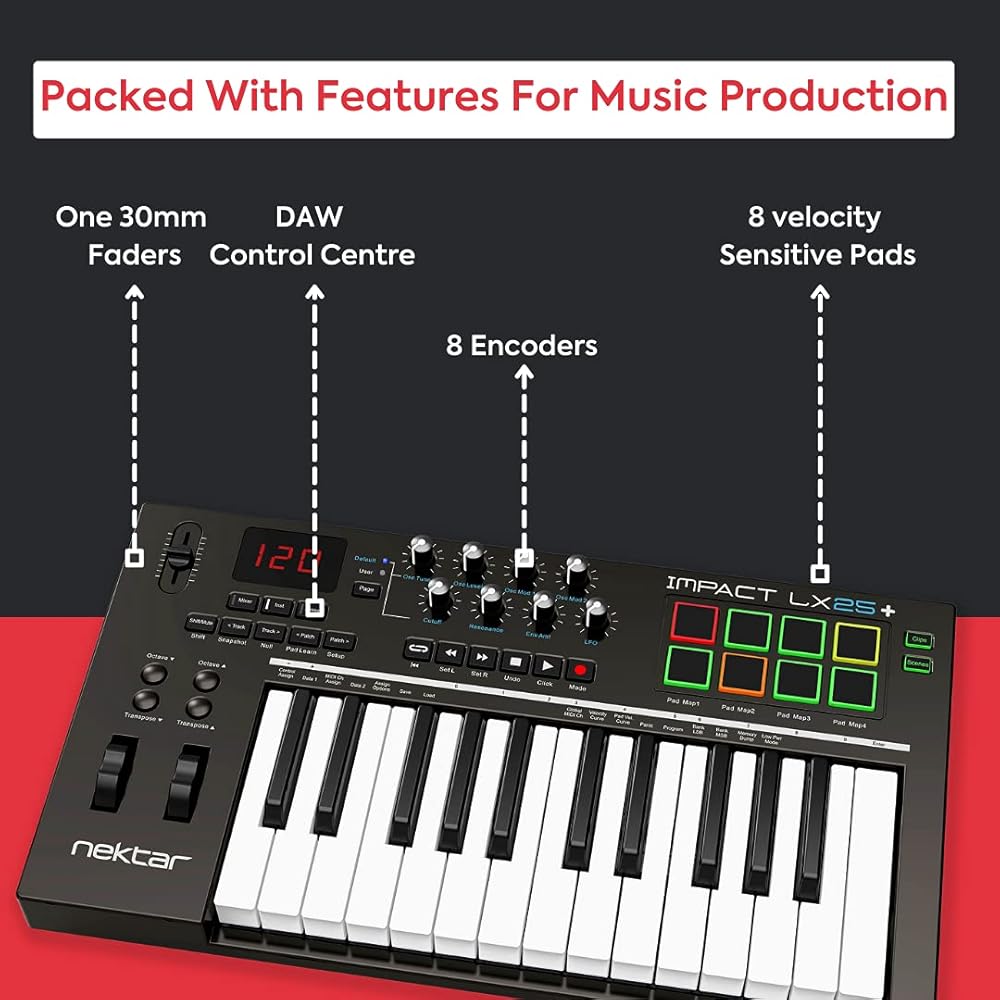 POWERFUL CONTROL CENTER: Impact LX25+ features programmable real-time controls: 1x 30mm fader and 8x potentiometers. Each control is fully programmable to send unique MIDI messages and can be stored in any of the 5 user presets. So you can control up to 5 different devices and switch between them seamlessly, in addition to DAW integration