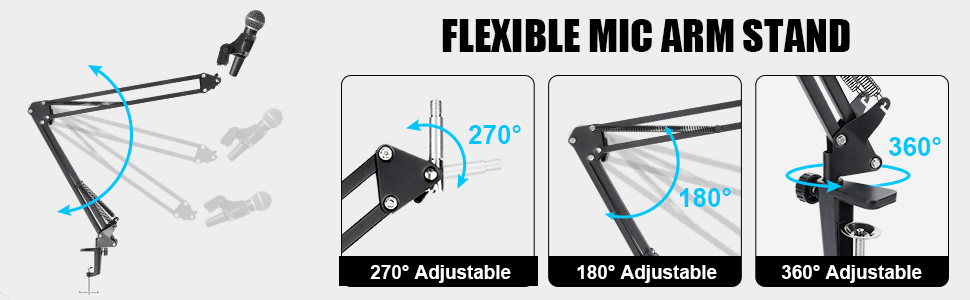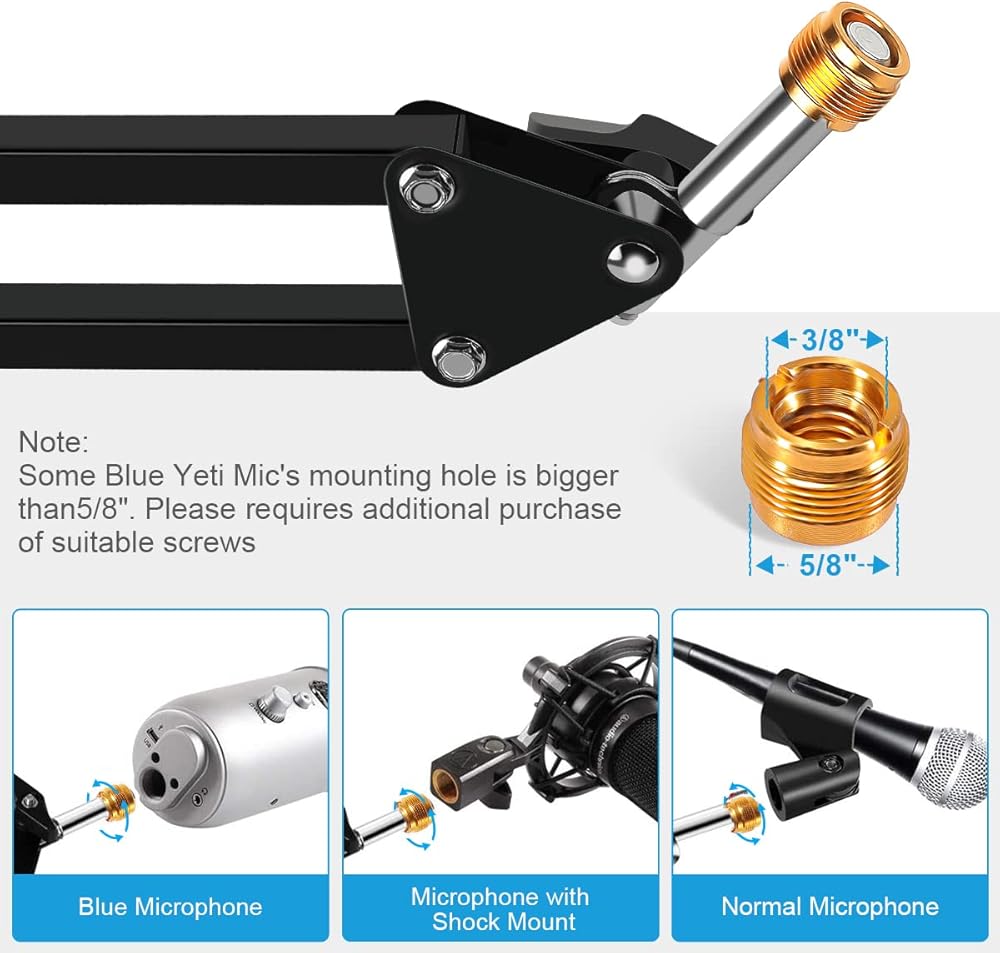 【Flexibility & Applicability】 The microphone boom arm can rotate 360 degrees left and right and Move up and down 180°. With its upgraded clamp and protective cushion, the microphone arm fits on tables up to 2.1 inches thick. This mic boom arm set also includes a 3/8” to 5/8” screw adapter to suit most microphones. The mic stand can work perfectly with Blue Snowball and most other microphones.