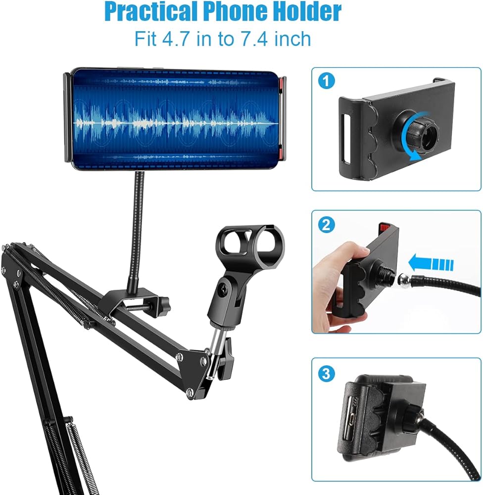 【Complete Microphone Stand Set】 Our professional microphone stand set includes everything needed for studio recording or broadcasting, 1 x microphone arm stand, 1 x table clamp, 1 x shock mount, 1 x mic holder/clip, 1 x pop filter, 1 x mic cap, 1 x metal screw, 5 x cable ties to reduce clutter, as well as 1 x phone holder for added convenience. The microphone arm can be folded for easy carrying and storage.