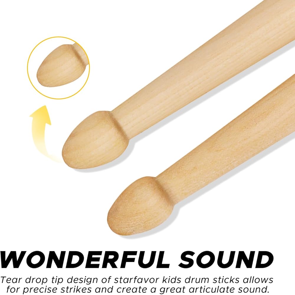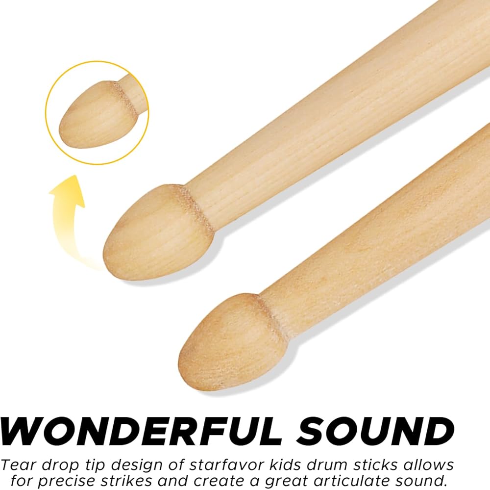 Starfavor Drumsticks for Kids, Drum Sticks Personalized Kids Size Classic America Maple Wood Lightweight Tear Drop Tip Drumsticks Anti-Slip and Durable - 6 Pair