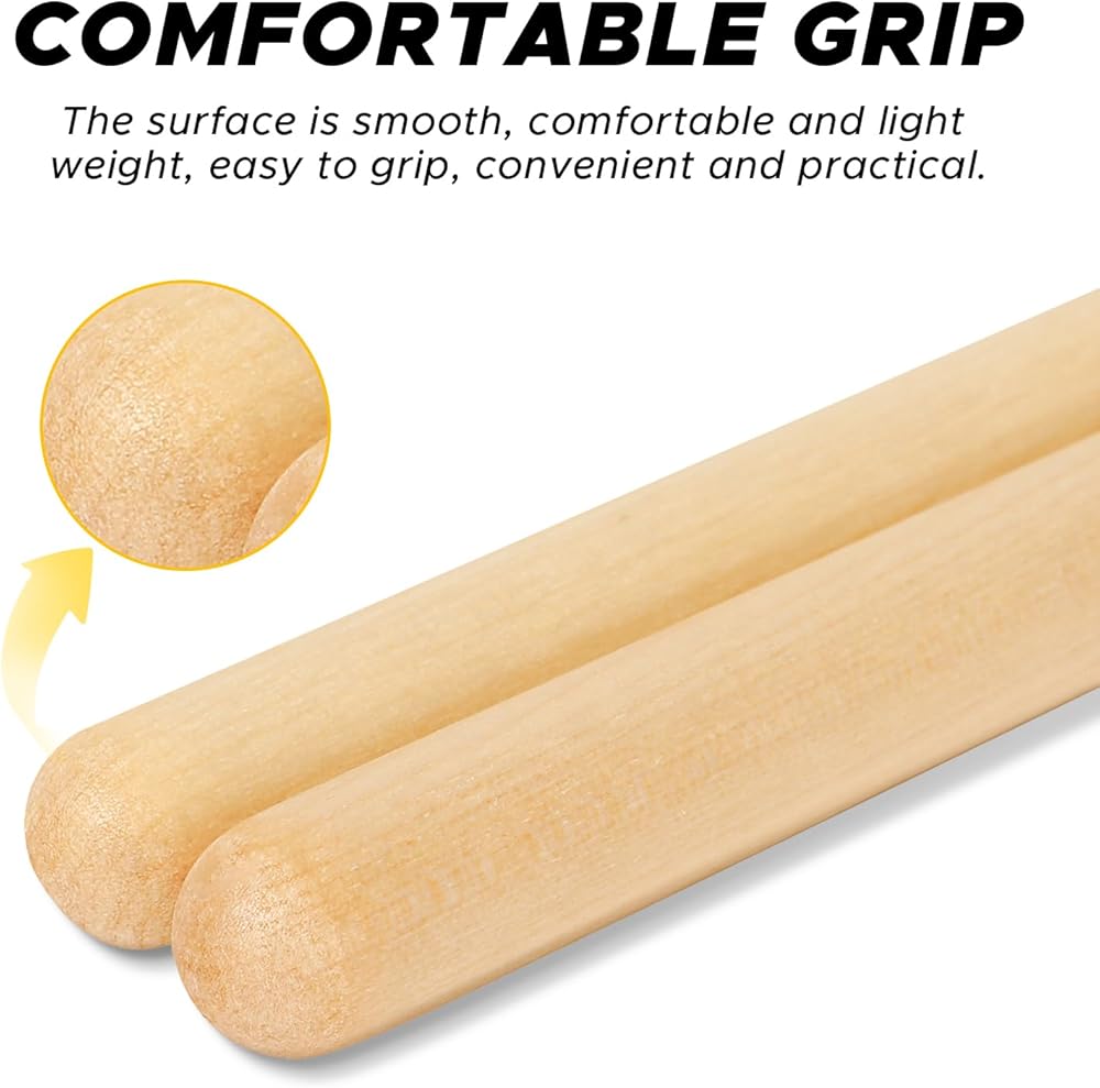 【Excellent Tip Design】Tear drop shaped tip Drumsticks design of these kids drum hitting, and the lighter drumstick tips result in faster rebounds. Offers a wide range of rounded tones to a sharper, more powerful sound.