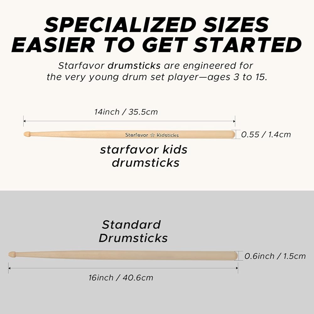 【Lightweight for Kids】Made of premium North American Maple wood, which is 10% lighter in weight than walnut wood. Our kids drumticks are 2 inches shorter than the standard 16 inches and weigh only 2.65 pounds. They are exceptionally suitable for young beginner drummers aged 3-15, even girls with less strength can play drum set easily.