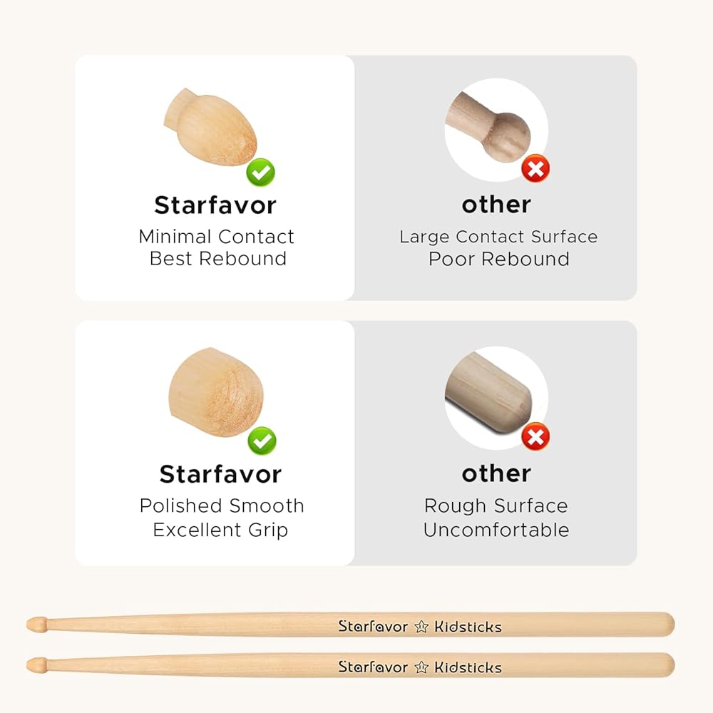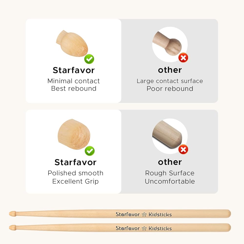【Environmental-friendly Lacquered Design】The surface of the drum stick has been precisely polished and lacquered, non-toxic and odourless. Providing comfort, safety, and a secure grip during extended play sessions for kids. Just enjoy each beat with Starfavor as you wish.