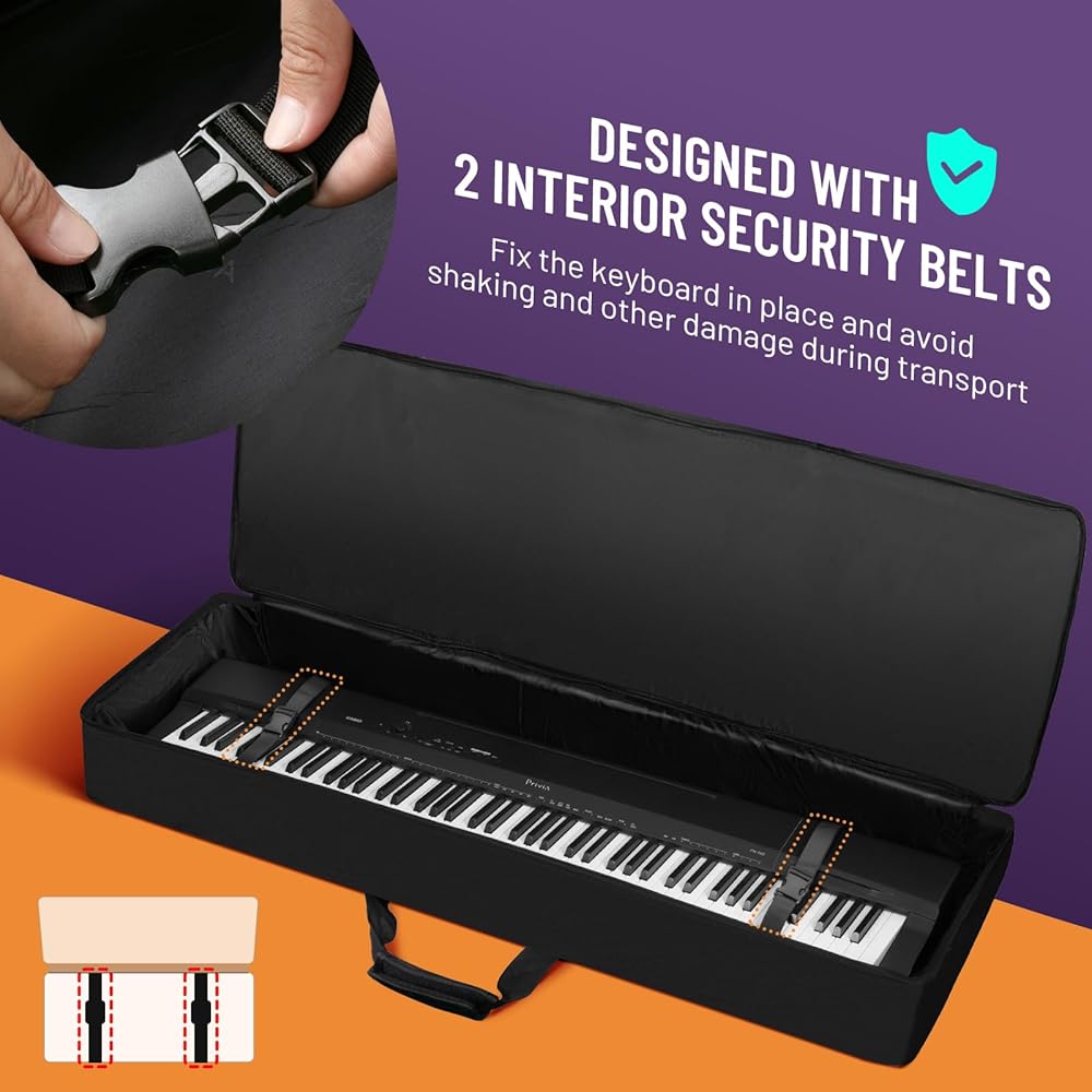 The piano keyboard case designed with 2 interior adjustable security belts to fix the keyboard in place, avoid shaking and other damage during transport between gigs or practice.