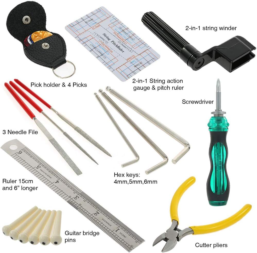 Package Includes:1x Guitar Wire Plier,2 x fingerboard protector,3 x Files,3 x Hex Wrench,1 x Steel String Ruler,1 x String Action Ruler,1 x Muti Spanner Wrench,6 x Bridge Pins,1 x Picks Bag,4 x picks,1x peg winder,1 x Screwdriver,1x Storage Bag