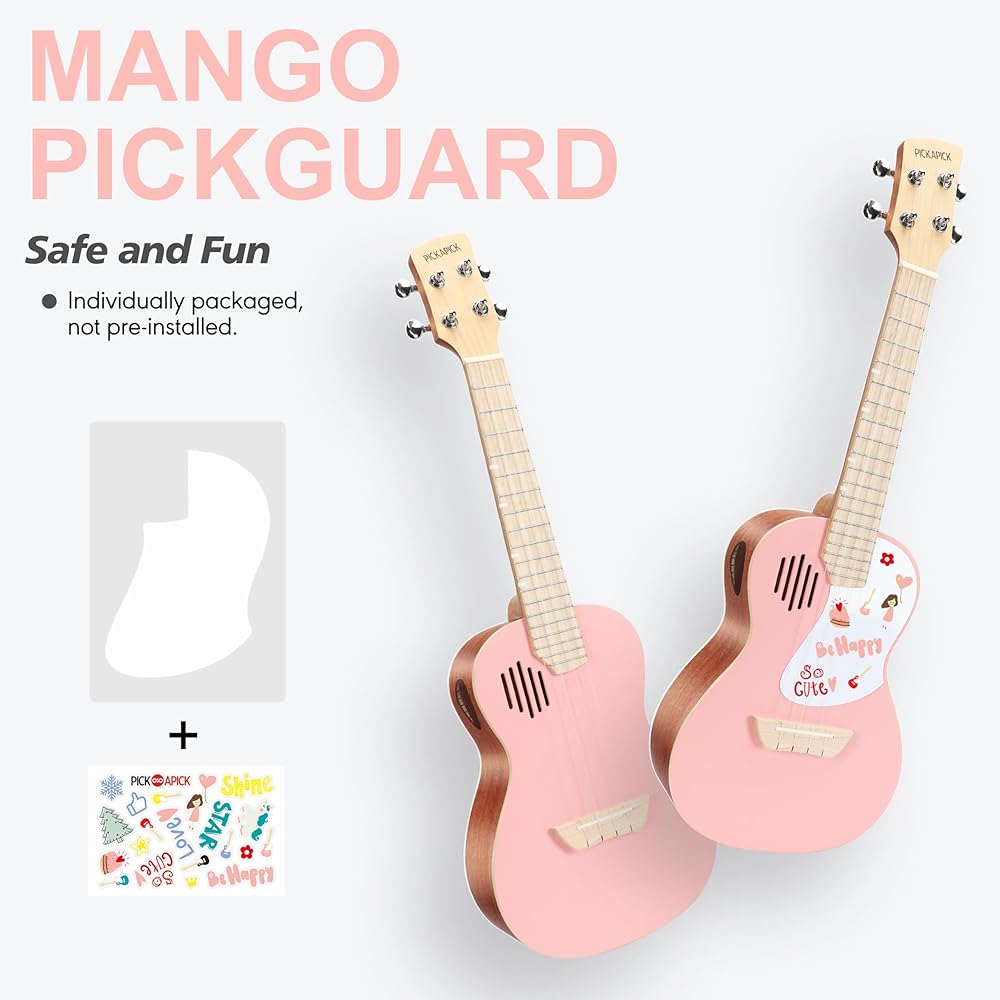 - 𝐅𝐮𝐧 𝐌𝐚𝐧𝐠𝐨 𝐏𝐢𝐜𝐤𝐠𝐮𝐚𝐫𝐝- Featuring a mango pickguard for string protection and colorful stickers for personalization.