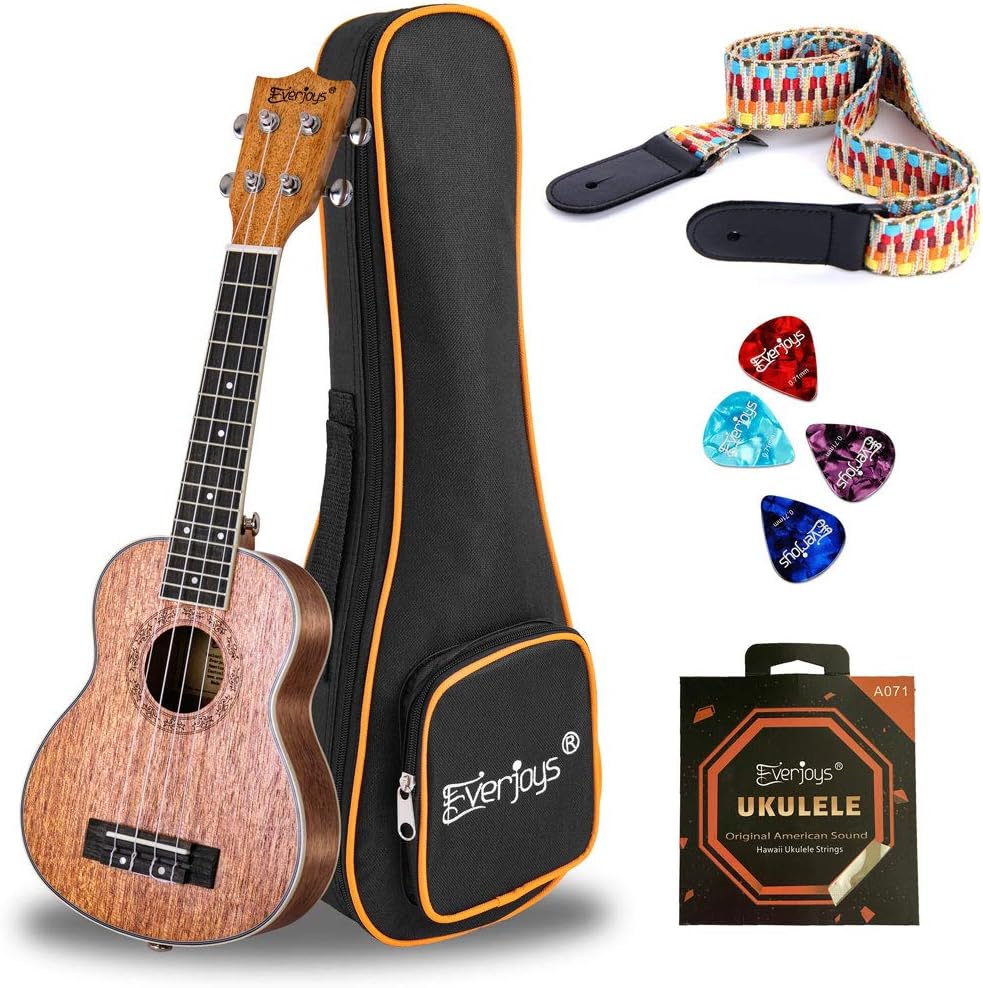 Everjoys Soprano Ukulele Mahogany 21 inch - Professional Wooden Ukelele Instrument Kit With Gig Bag Strap Picks Strings Free Online Lessons All in One Kit