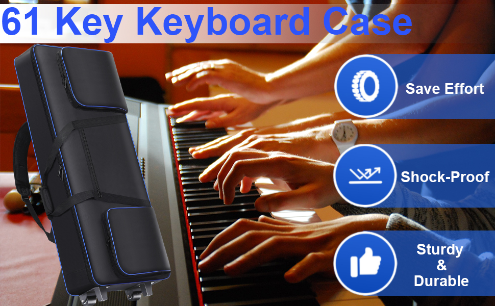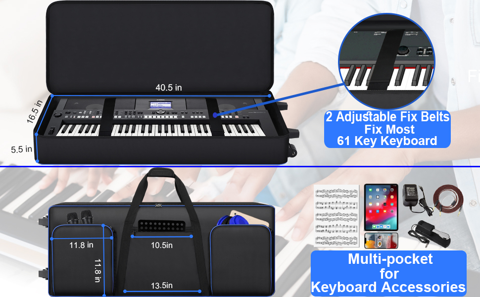 【Full Protection for 61 Key Keyboard】There are thick padded covered in 61 keyboard case, which protect your keyboard from bumps, scratches or other damages. 2 interior adjustable security belts to tight your keyboard, avoid damage by shaking during transport, ensure your keyboard stays safe.