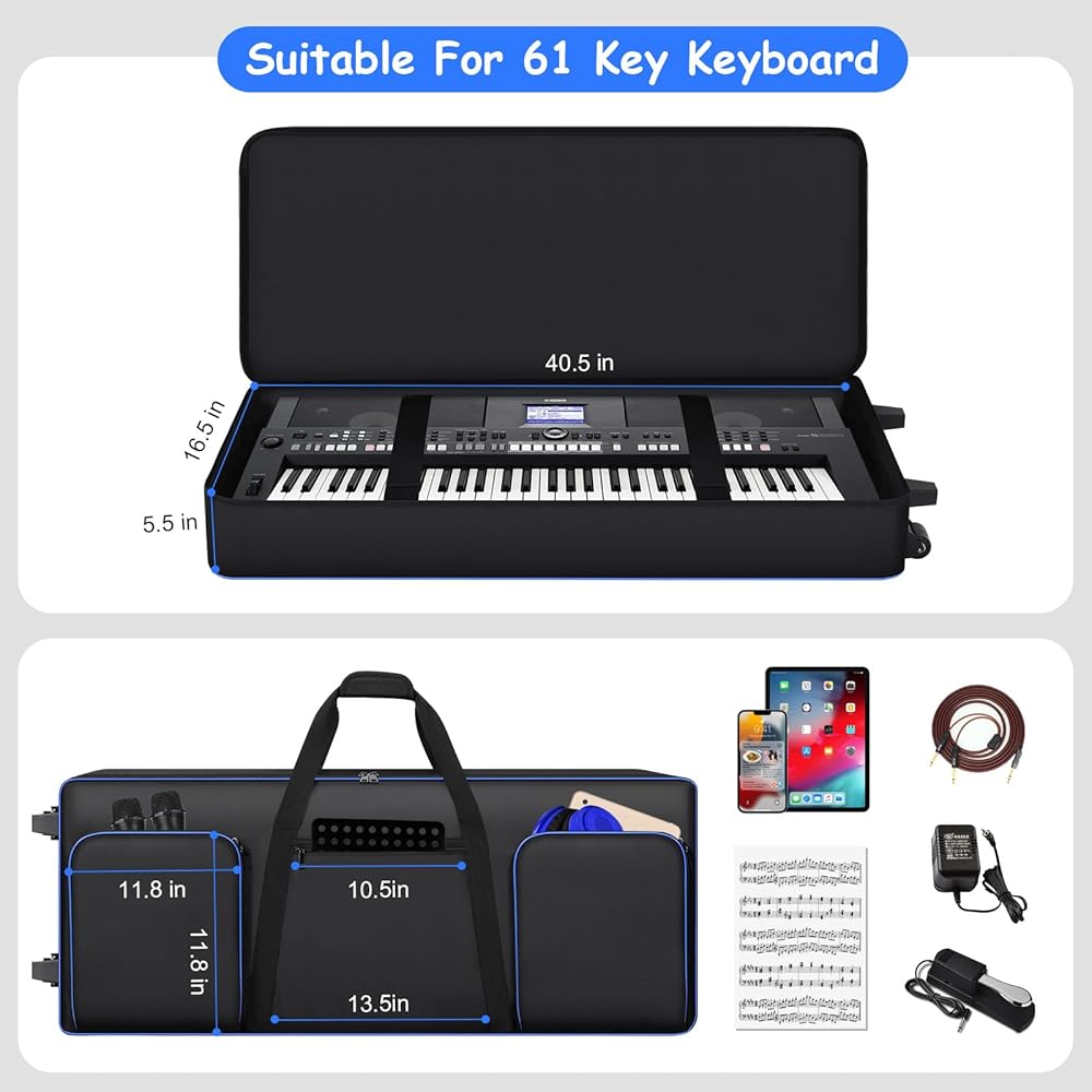 【61 Key Keyboard Case with Wheels】The 61 key keyboard case has internal dimensions of 40.5"x16.5"x5.5". Please check the size of your keyboard before purchasing. The roller 61 key keyboard case comes with wheels and handles for easy portability. You can use it as a suitcase to carry your keyboard, save your energy and focus more on your playing. Keyboard case with wheels is compatible with Yamaha, Kcasio, Roland, Alesis,(NOT ALL 61-Key Keyboard). NOT COMPATIBLE WITH Korg.