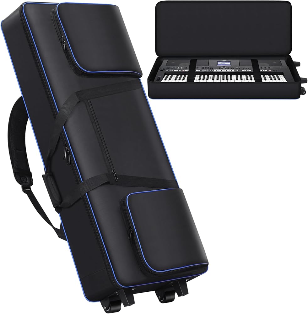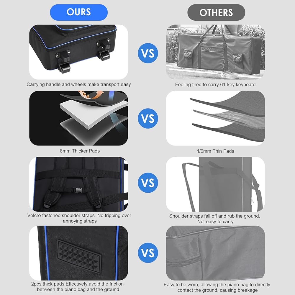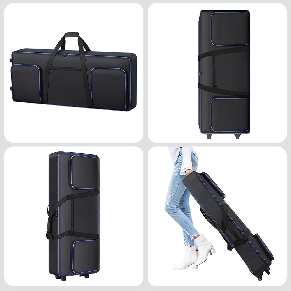 【3 Ways to Carry Keyboard】With a firm soft handle, you can carry your 61 key keyboard bag with one hand, and will not be uncomfortable for long-term use. 2 adjustable ergonomic padded shoulder straps allows you to carry the piano bag as backpack, freeing your hands to do other things. Equipped with 2 high quality wheels, you can use it as a suitcase to carry your 61 key keyboard easily.