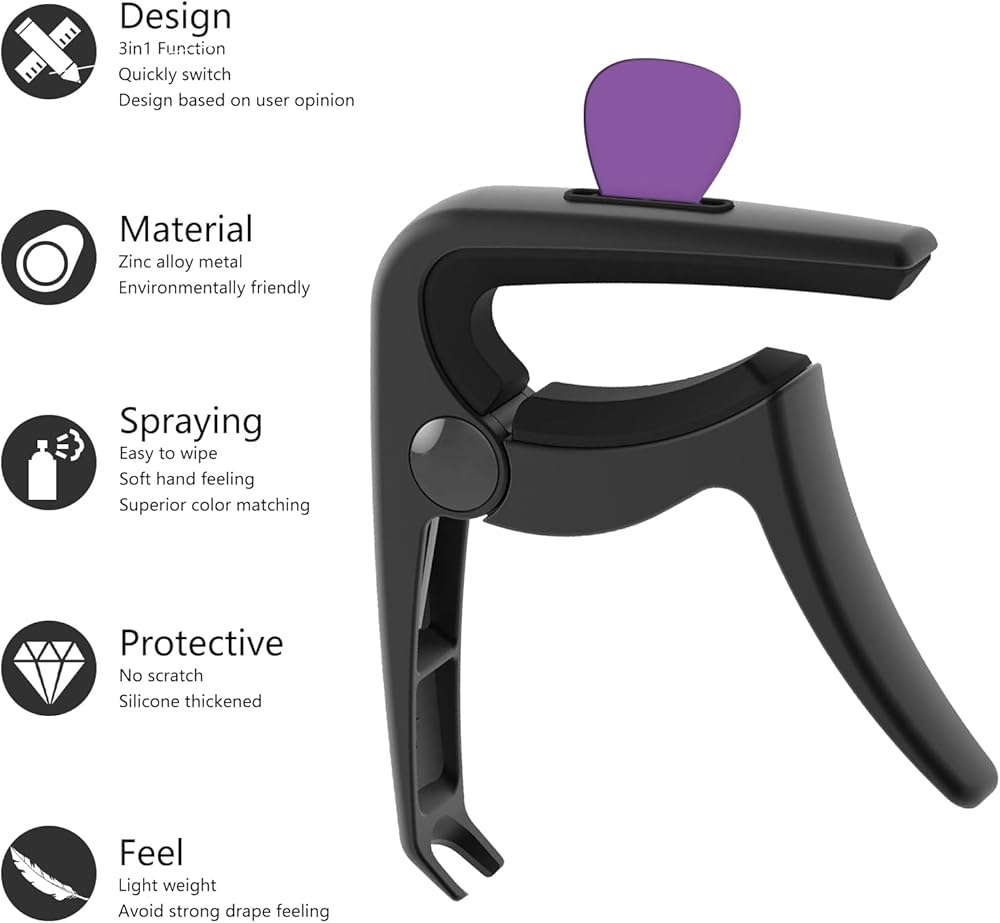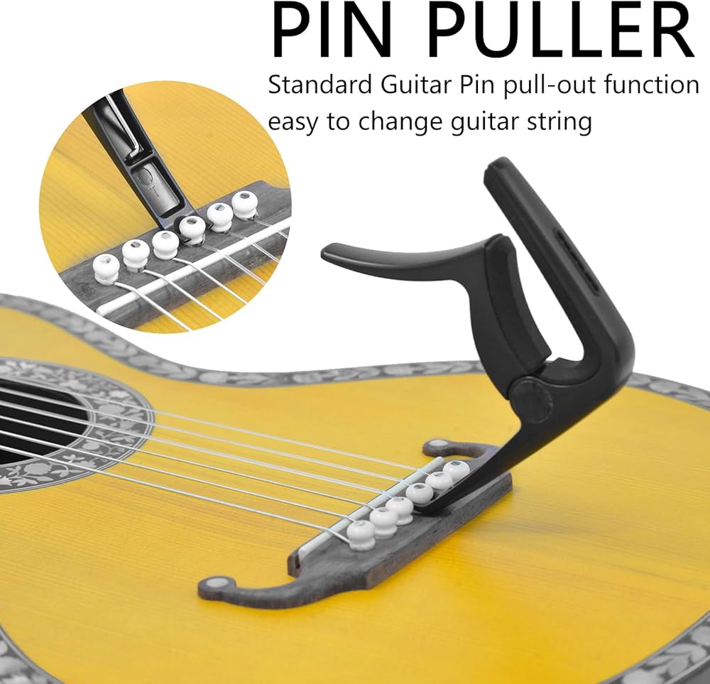 3IN1 Design-Guitar capo, Functional for Capo, Guitar Pin Puller and Pick holder 3 in 1. Good-looking Pick Slot designed for easier accessing.