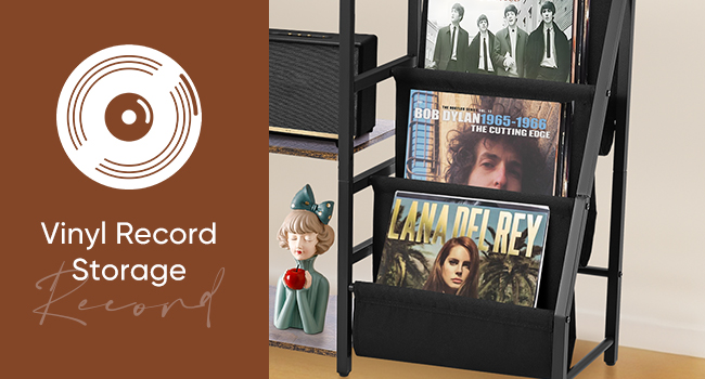 Durable and Sturdy Construction. Crafted with high-quality materials such as strong wooden boards, reinforced iron, and soft oxford fabric, our record shelf is built to last. The adjustable feet ensure stability, while the soft rubber rack arms provide a secure and scratch-free support for your valuable instruments.