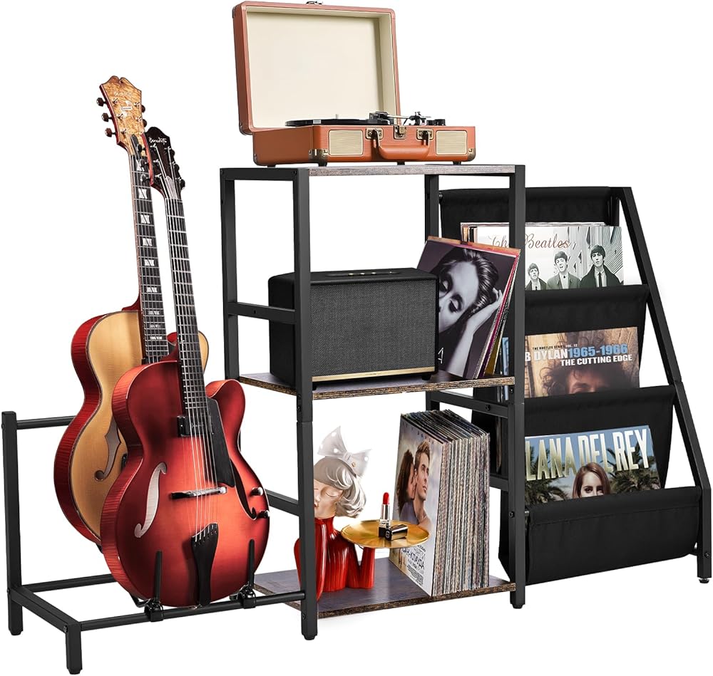 Guitar Stand for Multiple Guitars. Our 3-tier record player stand offers a side storage area perfect for your record player, albums, amps, books, magazines, CDs, and collections. The adjustable guitar rack arms can securely hold various types of guitars, including electric guitars, basses, and Ukuleles, allowing you to showcase your instruments in style.