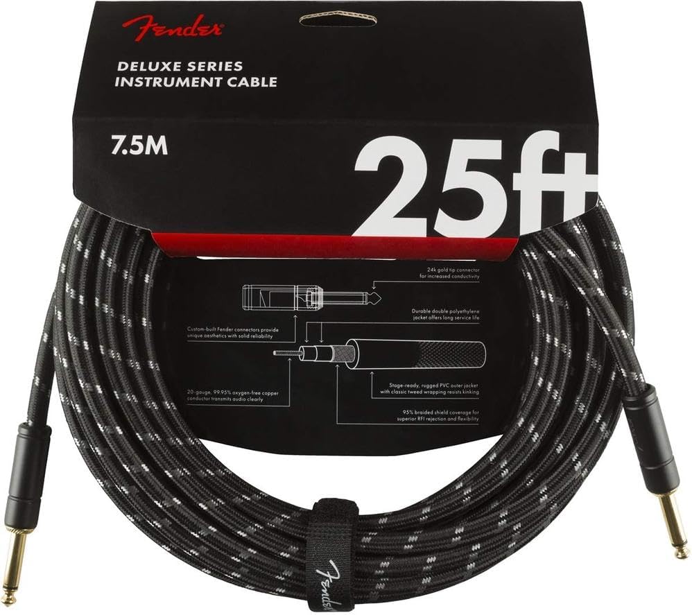 Fender deluxe Series cables carry the highest quality materials and braided shielding to deliver flagship durability, conductance and transparency. Our top-of-the-line cables sport custom molded ends with strain relief under the housings 24K gold-plated connectors that won't tarnish or degrade your sound over time. These cables use a very quiet braided shielding that is engineered to maximize the purity of your tone, and they're protected by a soft-woven yet rugged tweed jacket that provides ultimate protection with classic Fender style.