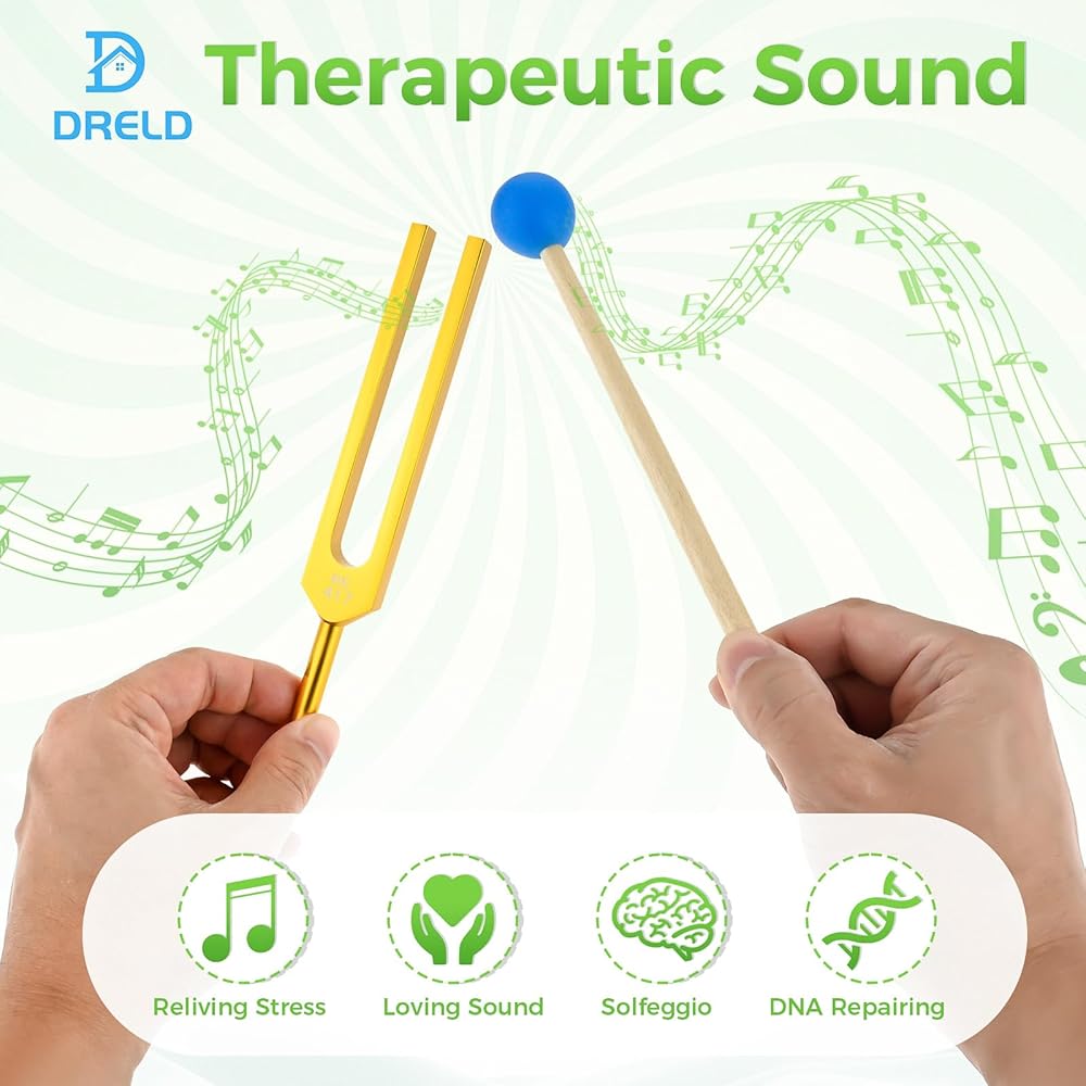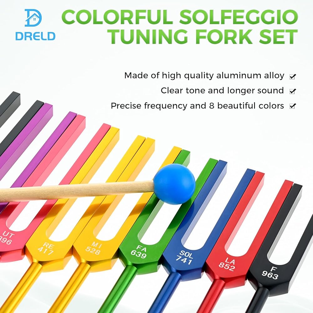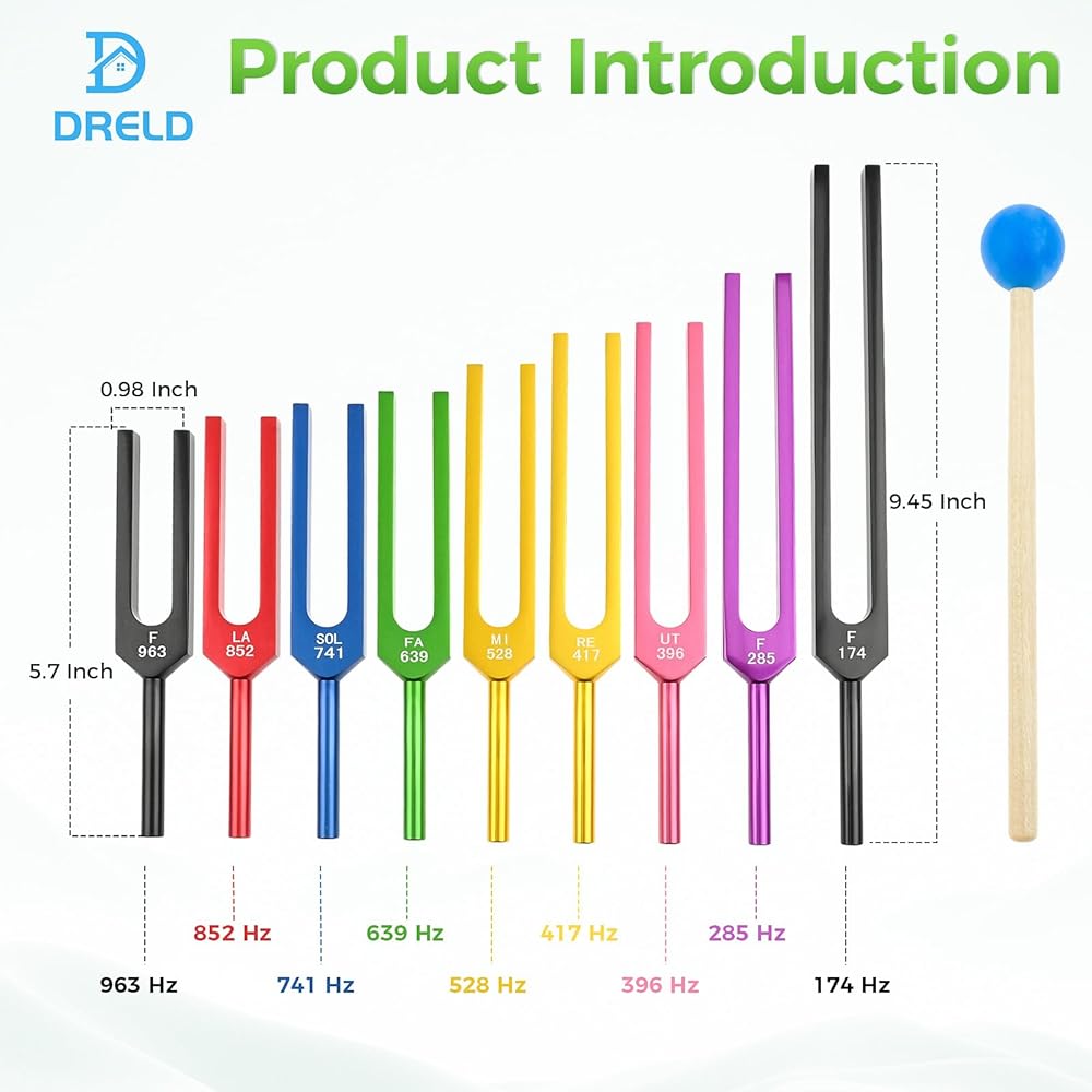 [WHAT YOU GET]: 8 tuning forks Set included 174 Hz, 285 Hz, 396 Hz, 417 Hz, 528 Hz, 639 Hz, 741 Hz, 852 Hz, 963 Hz, Silicone Hammer and Bags
