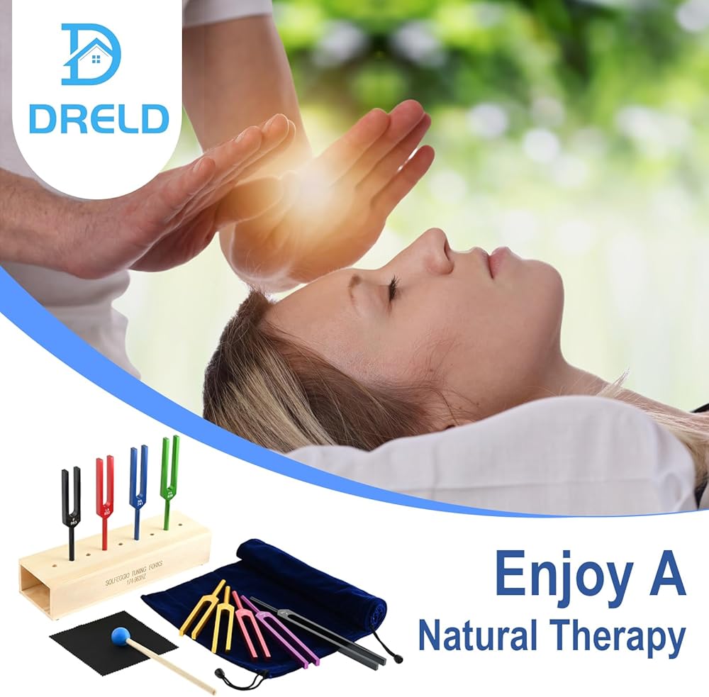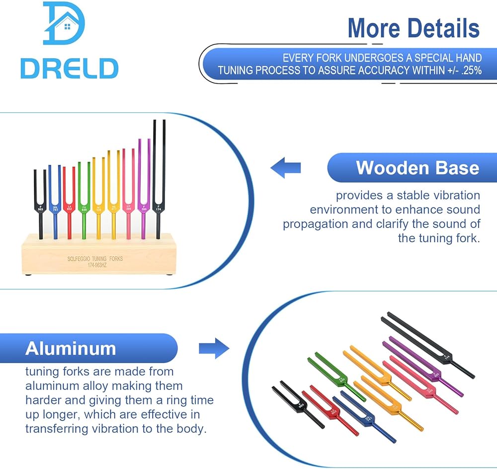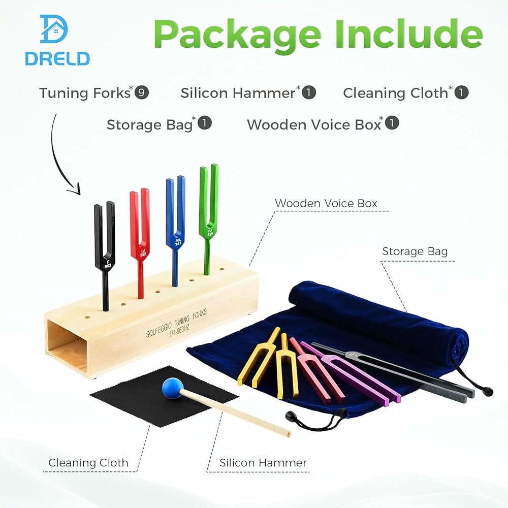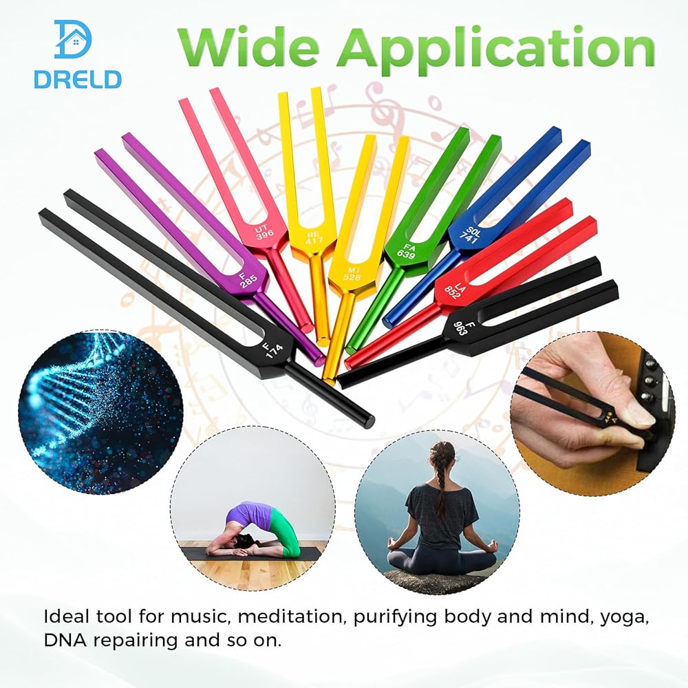 [COMPATIBLE]: Set of 9 tuning forks suitable for sound therapy, energy work, balance, meditation, stress relief, relaxation, perfect for health professionals, therapists. UT – 396 Hz – Liberating Guilt and Fear, RE – 417 Hz – Undoing Situations and Facilitating Change, MI – 528 Hz – Transformation and Miracles (DNA Repair), FA – 639 Hz – Connecting/Relationships, SOL – 741 Hz – Expression/Solutions, LA – 852 Hz – Awakening Intuition
