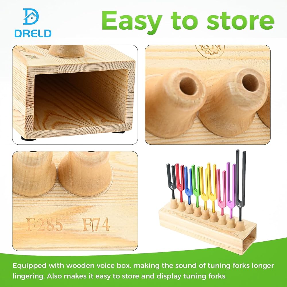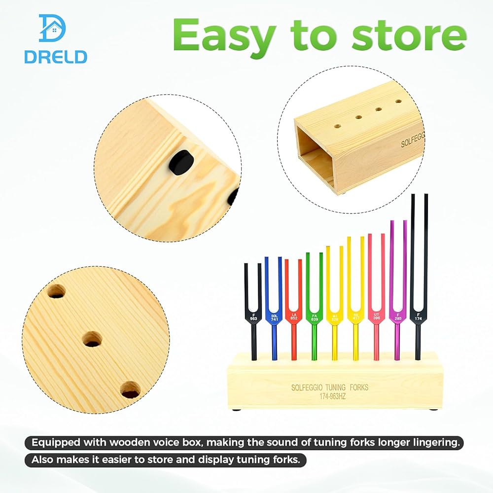 Solfeggio Tuning Fork Set for Healing - Unweighted Multi-Color 9 Tuning Forks for DNA Healing, Sound Therapy, Relaxing, Chakra, Reliever Stress, Keep Body with Hammer & Wooden Voice Box