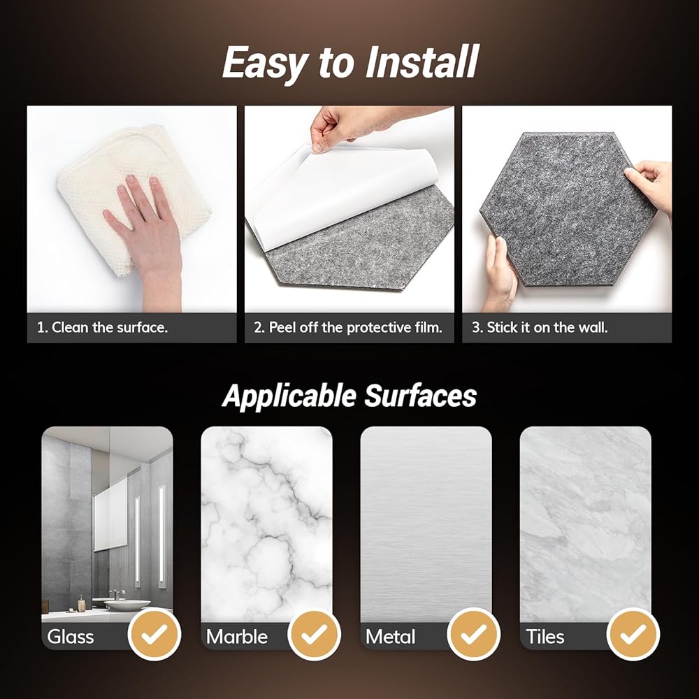 Easy to Install: Sound proof panels for walls can be easily installed on various surfaces like glass, marble, ceramic tiles, and metal sheets. Just peel off the protective film and stick the panels on the wall without the need for additional glue or tools.
