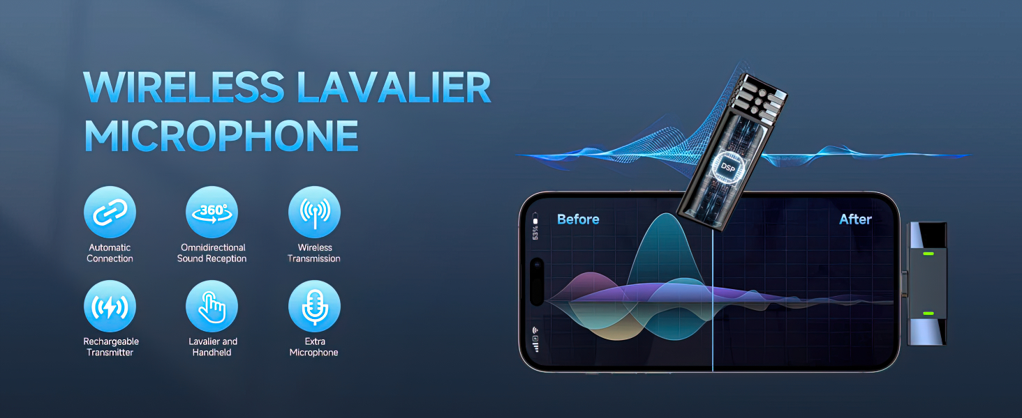 65 FT Transmission & Rechargeable : Adopts advanced 2.4GHz transmission technology with an ultra-low signal transmission delay (0.009 seconds), providing stable and clear audio transmission. It supports a stable, reliable, and high-fidelity audio reception range of up to 65 feet. and the high-quality DSP chip can bring more stable transmission. Wireless microphone transmitter has built-in rechargeable battery with working time up to 8 hours.