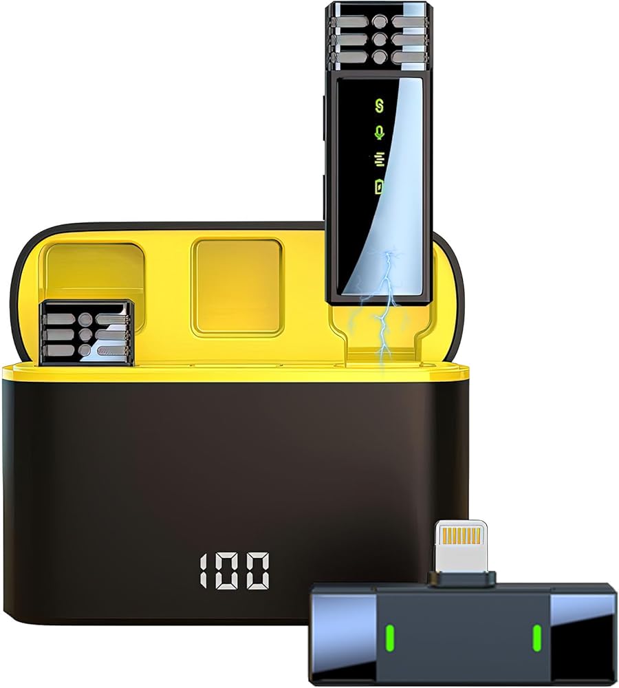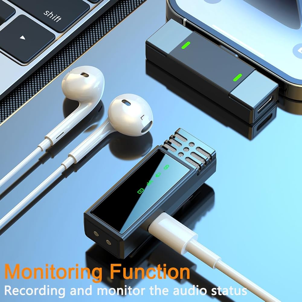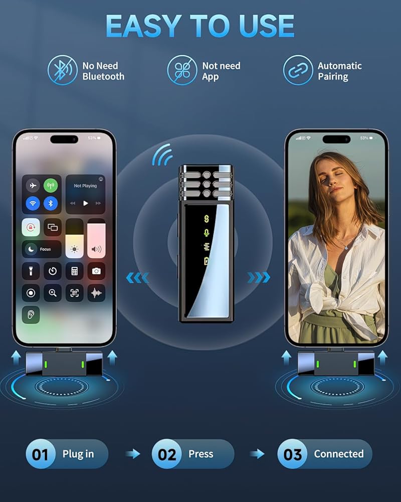 Plug and Play: Take the microphone out of the charging case, and it will automatically power on and connect seamlessly. No Bluetooth or APP needed. The wireless lavalier microphone can be clipped to the collar for hands-free audio and video recording.