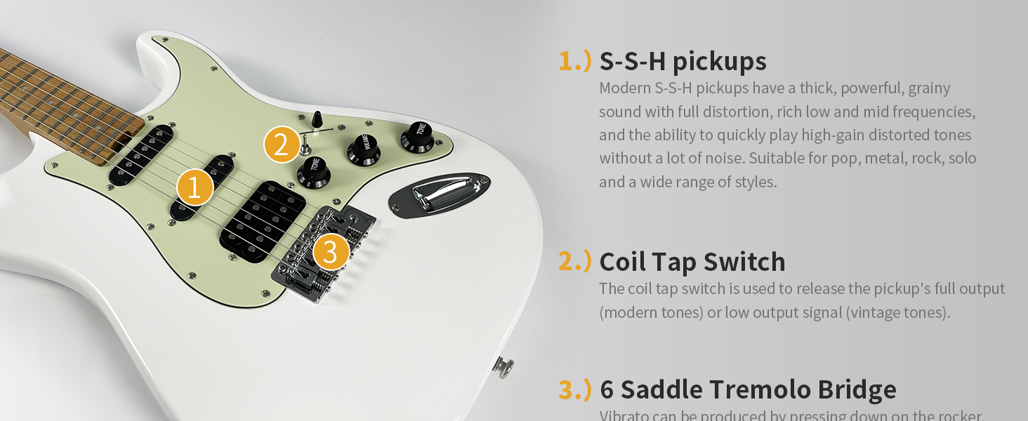 【Classic H-S-S Pickups】 Classic H-S-S pickups can give you a very nice distorted tone with the best tonal comprehensiveness, and you can add more tones with the coil separation switch to give you a different and new experience for many music styles.